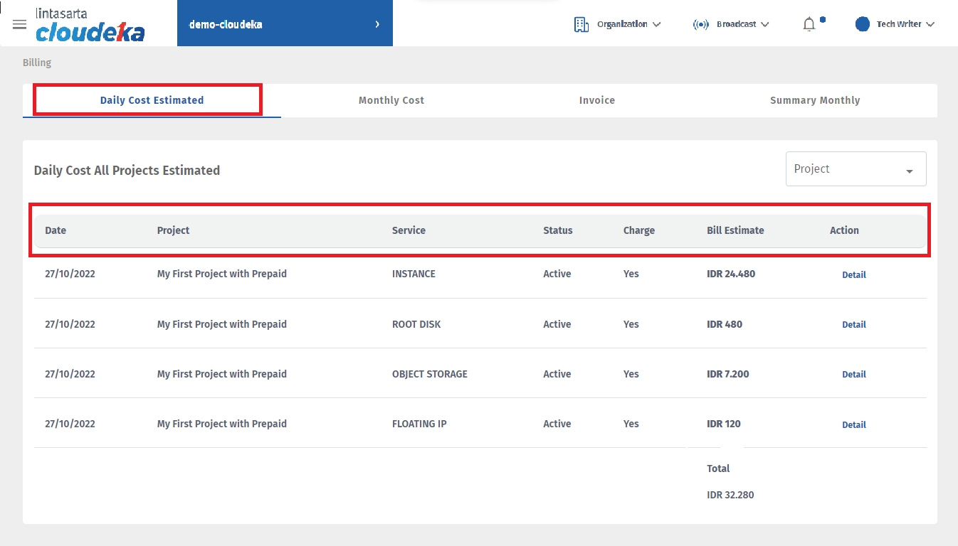 In this column there is a Detail button, if you click Details it displays the details of the service used: - Service Name, the name of the service used by the project. - Specification, the specification of the device used by the project. - Price, the price set for the service used by the project. - Billing Type, the type of payment used by the organization. - Created At, displays the date and time when the service was used by the project. - Deleted At, displays the date and time when the service is no longer used by the project. - Status, displays the state of the service used. - Usage, displays the total service usage used by the project. - Billed Estimated, the estimated cost used by the project.