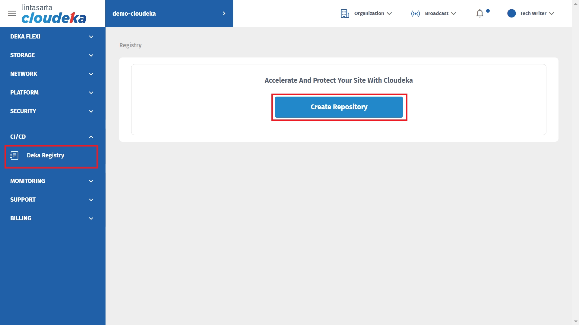 On the Cloudeka services page, click Deka Registry in the CI/CD and click Create Repository.