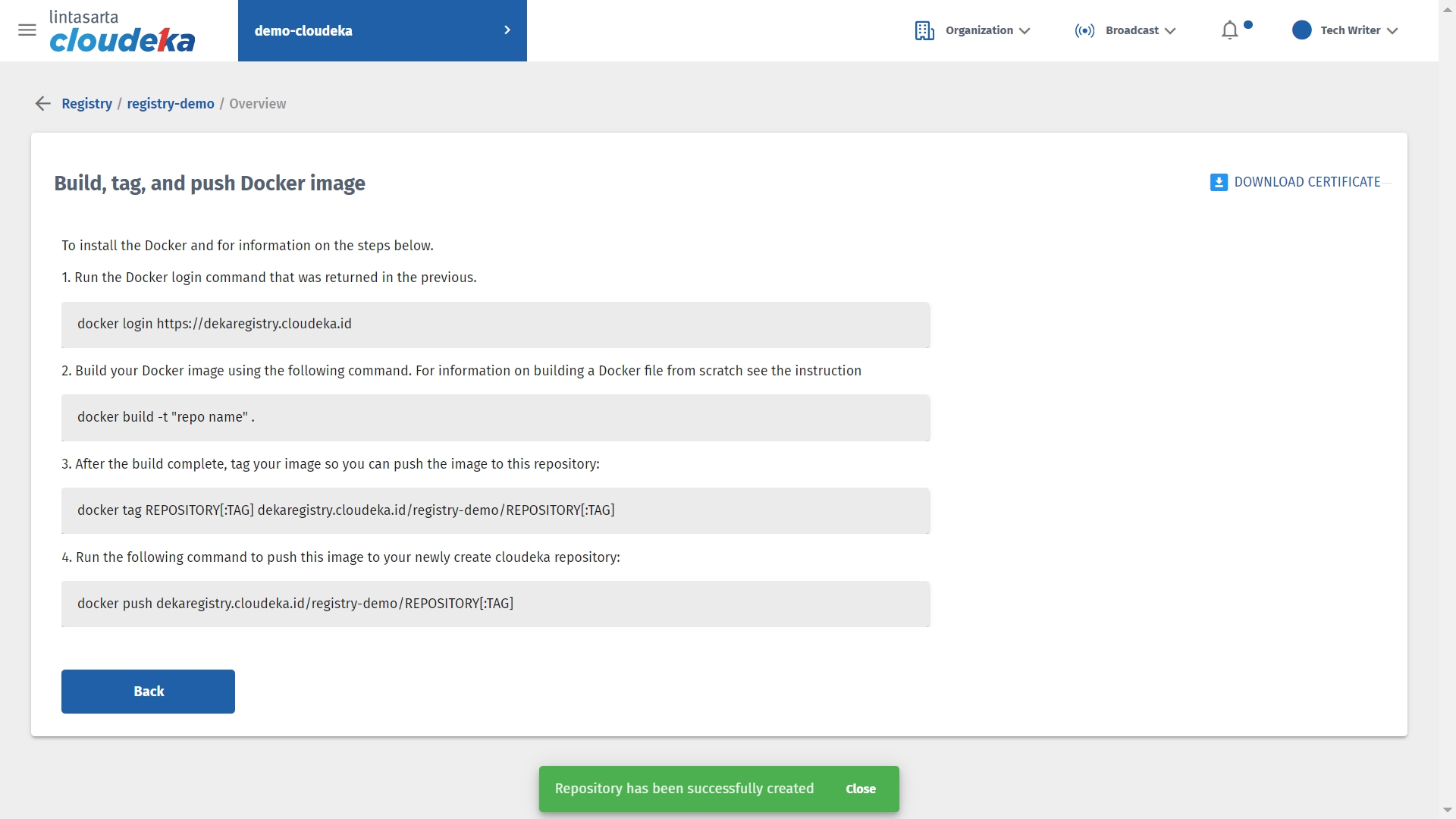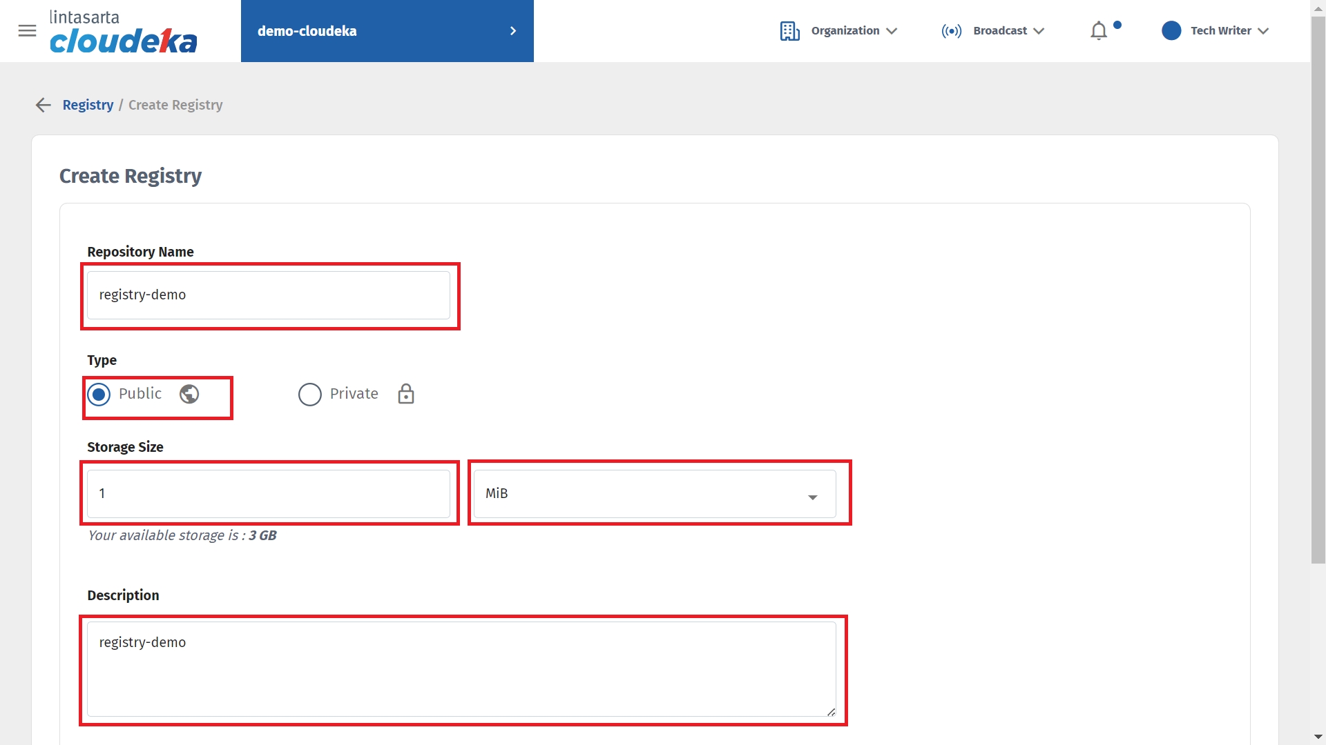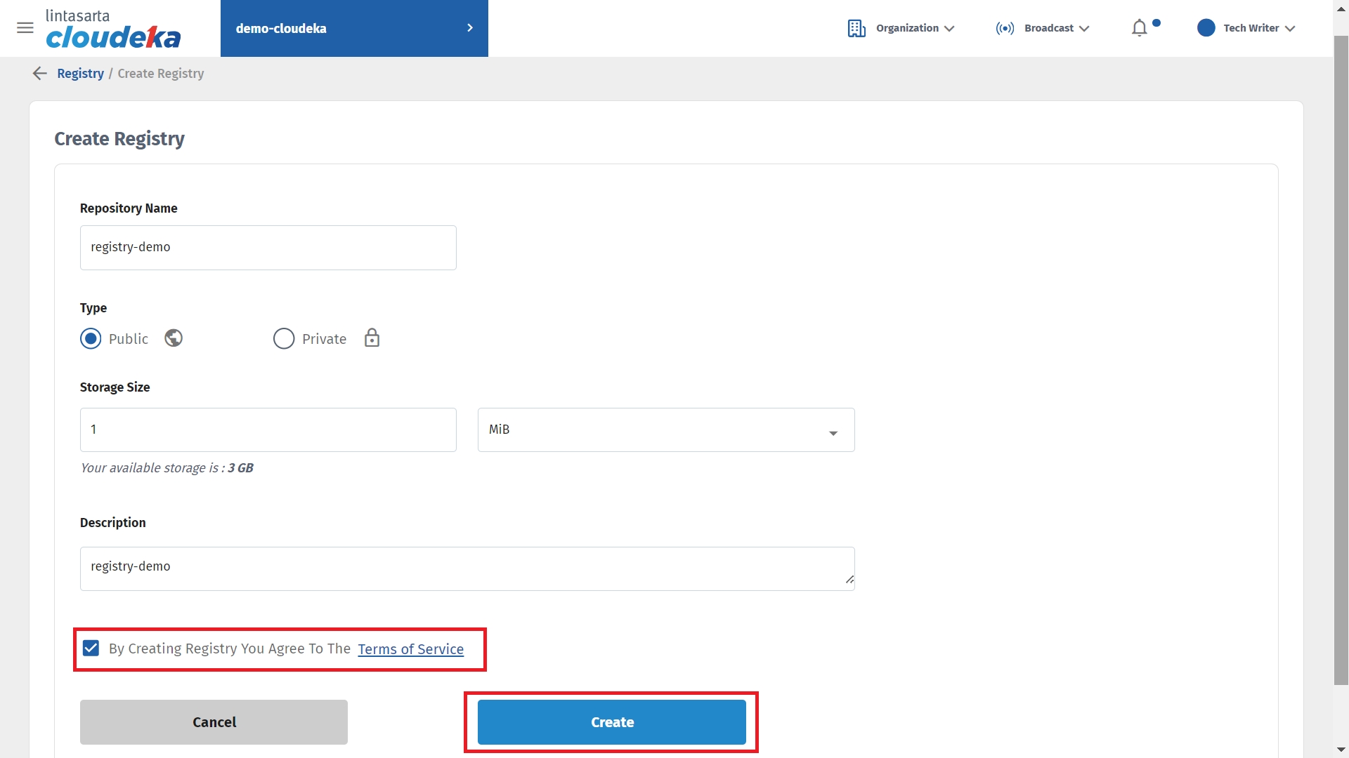 If you do not have a quota to create the Deka Registry, contact Superadmin to add the quota. Here are the steps to create a Deka Registry:
