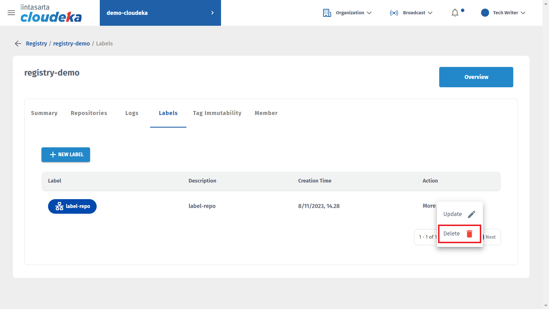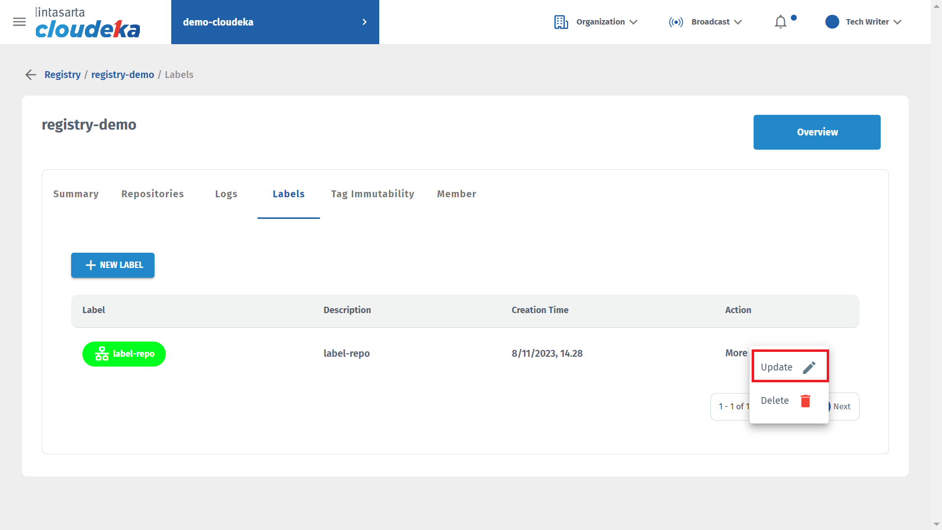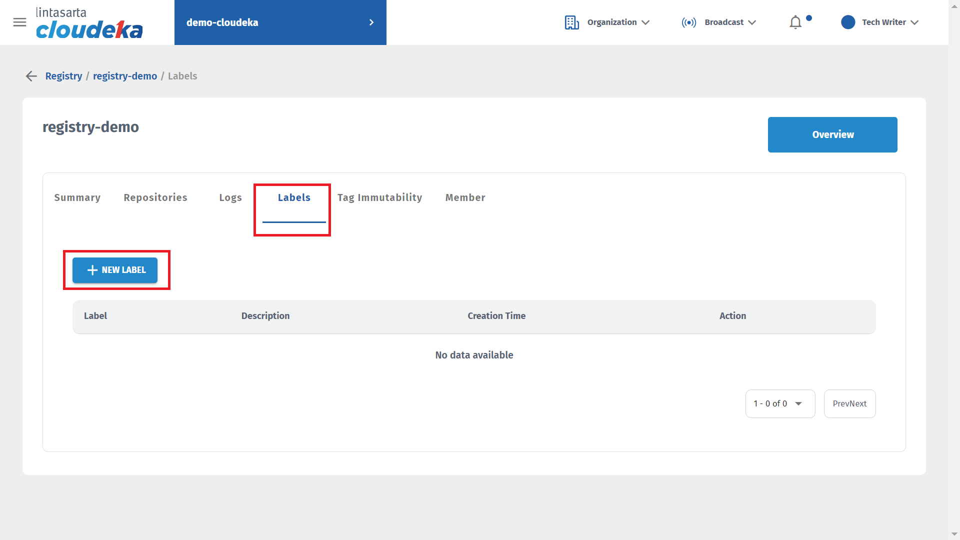 On the Labels tab of the Deka Registry can add labels, update labels, and remove unused labels.
