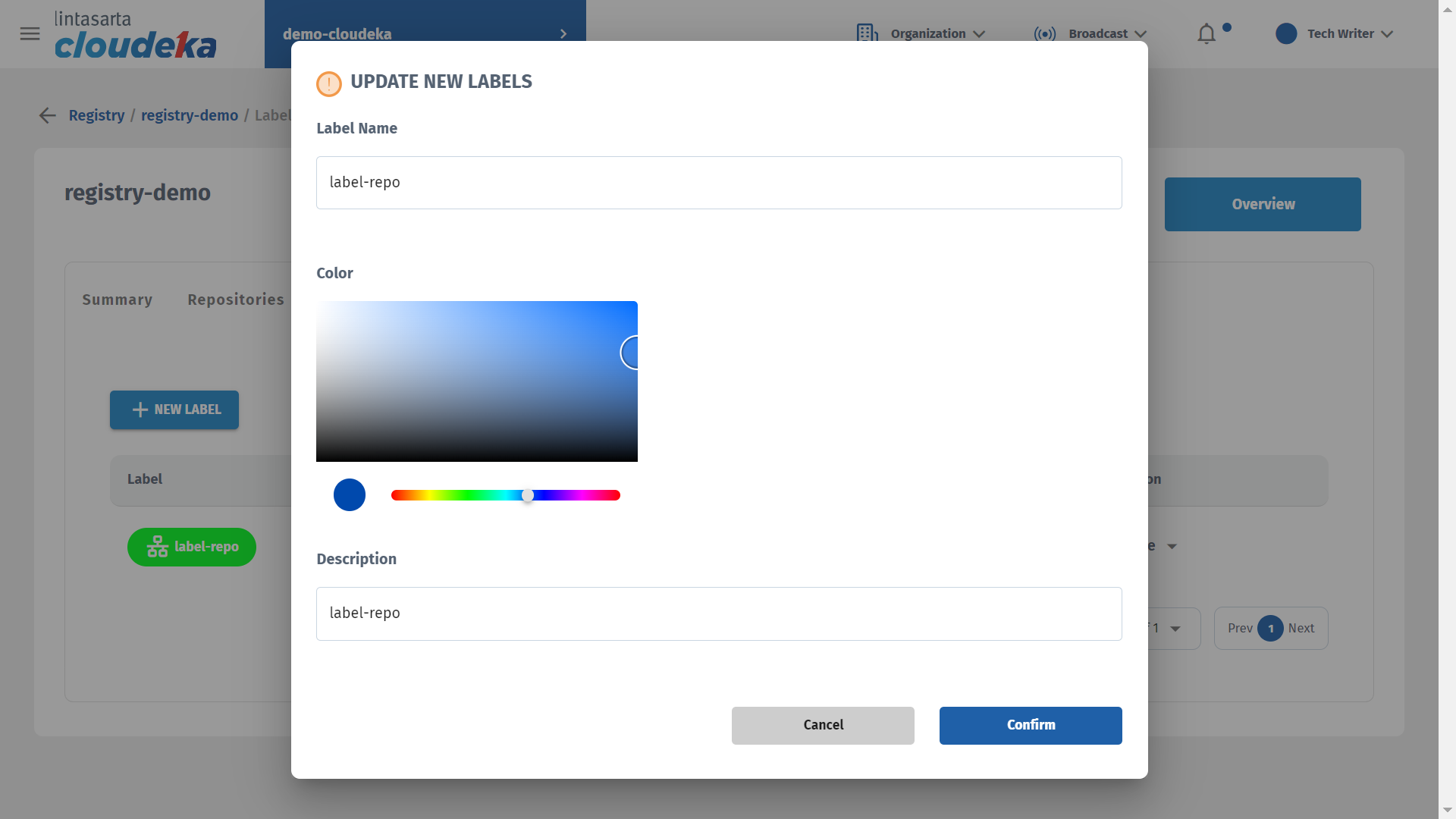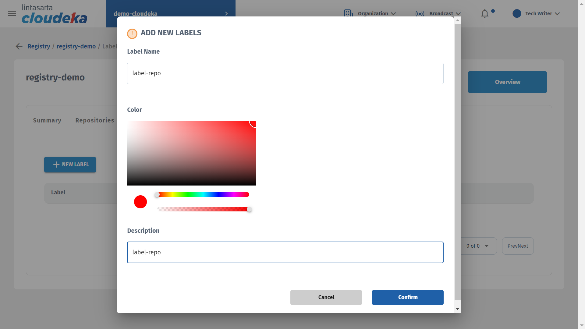 Enter a name in the Label Name column, select a color for the label, and add a label description in the Description column. Click the Confirm button to continue with the process.