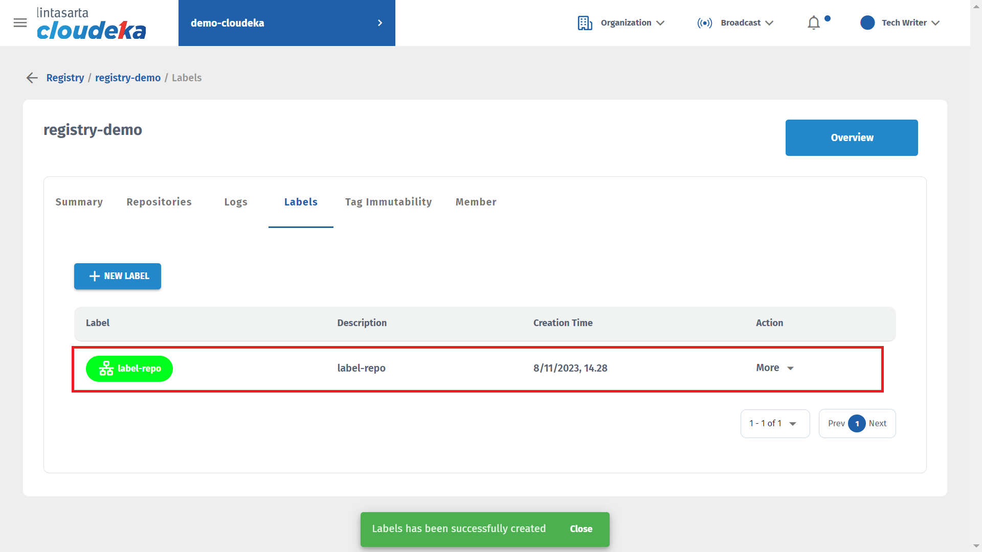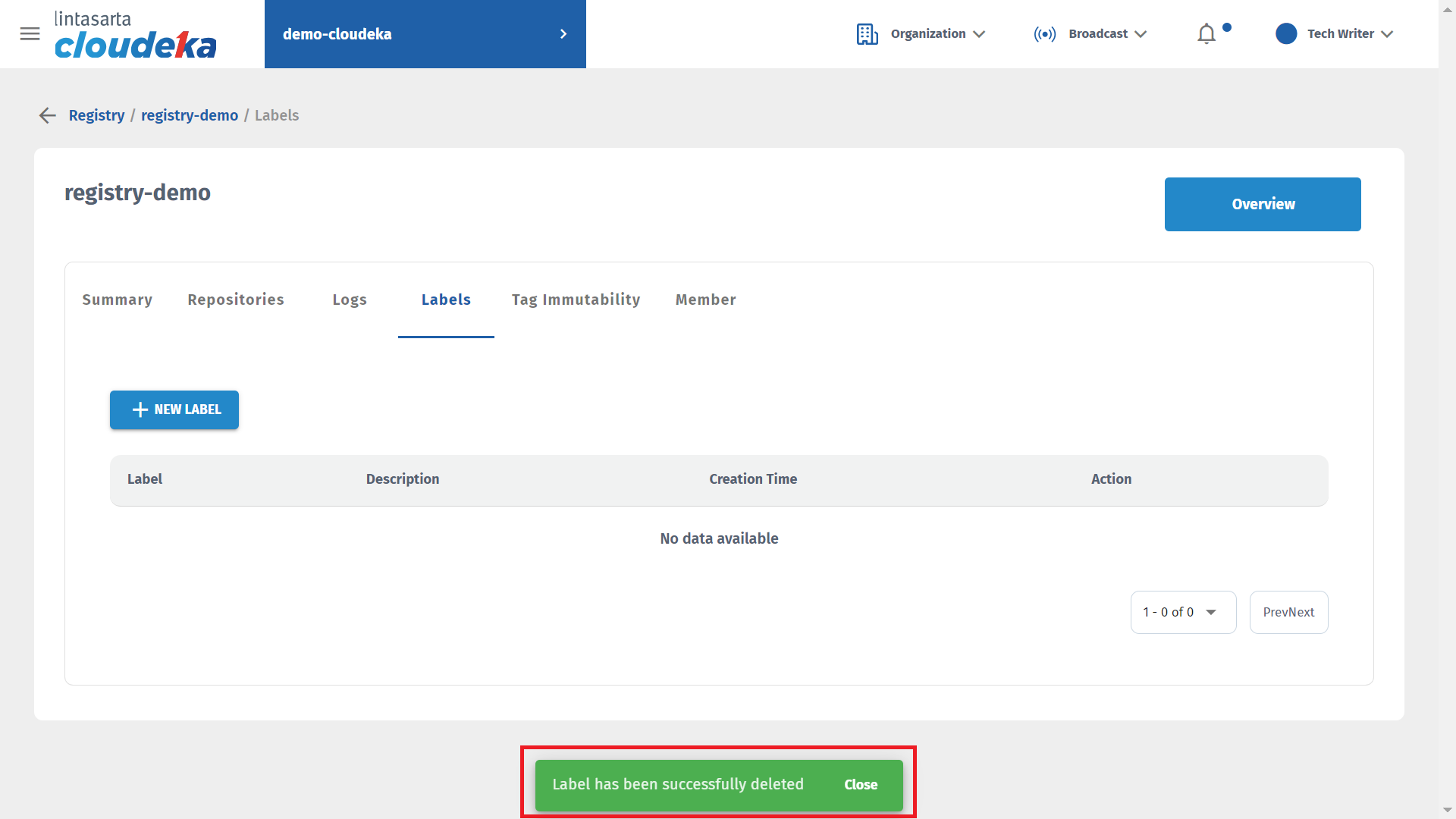 The Labels notification has been successfully created and the label was successfully added to the Deka Registry.