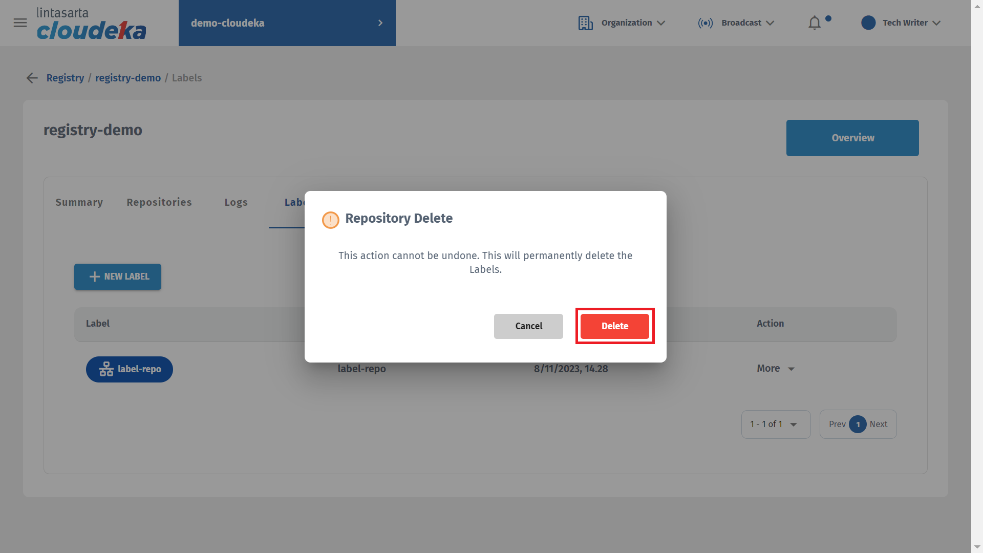 Here are the steps to remove a repository label in the Deka Registry on the Cloudka portal service.