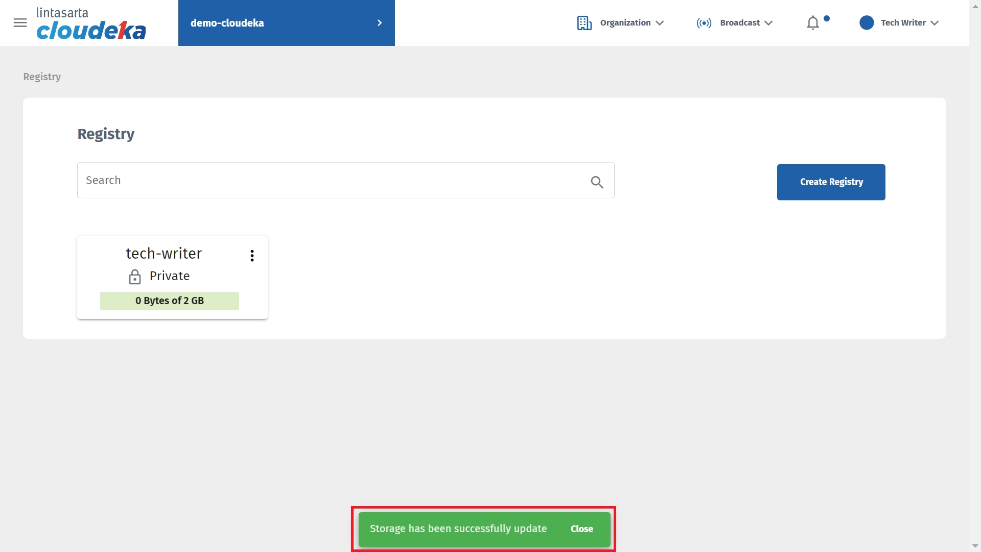 The notification "Storage has been successfully updated" appears.