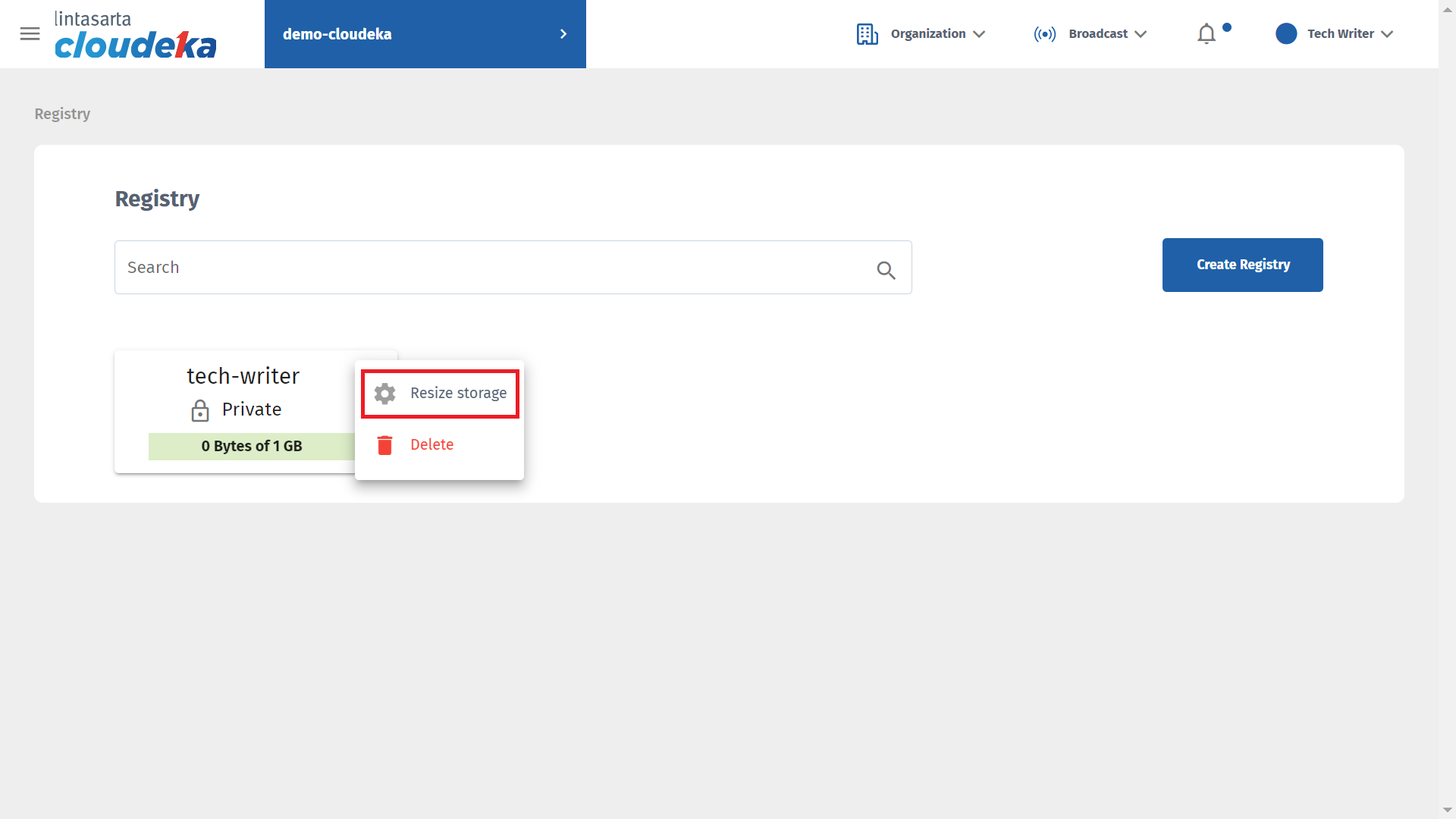 * On the Cloudeka portal services page, select Deka Registry in CI/CD. Press the three vertical dots button on the Registry.