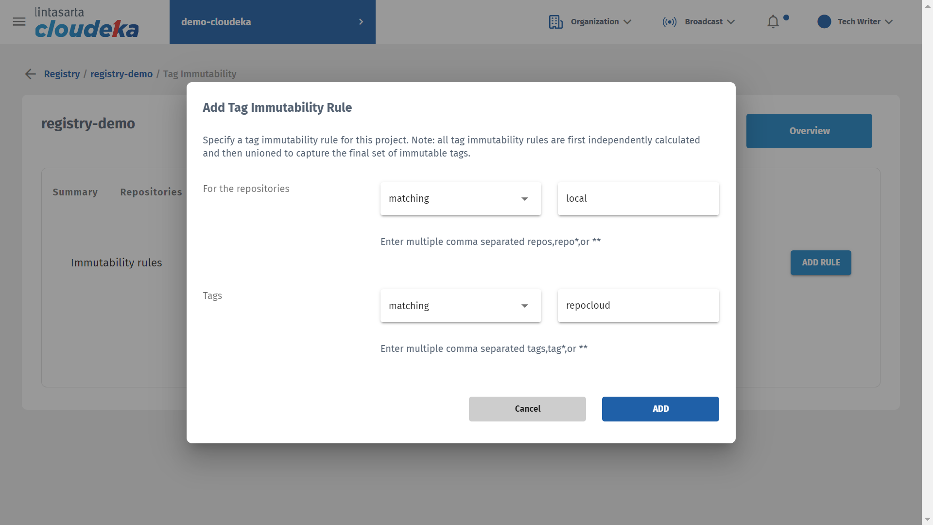 * The Add Tag Immutability Rule window displays, in the For the repositories section select matching or exclude according to your needs. Click the Add button to add a tag.