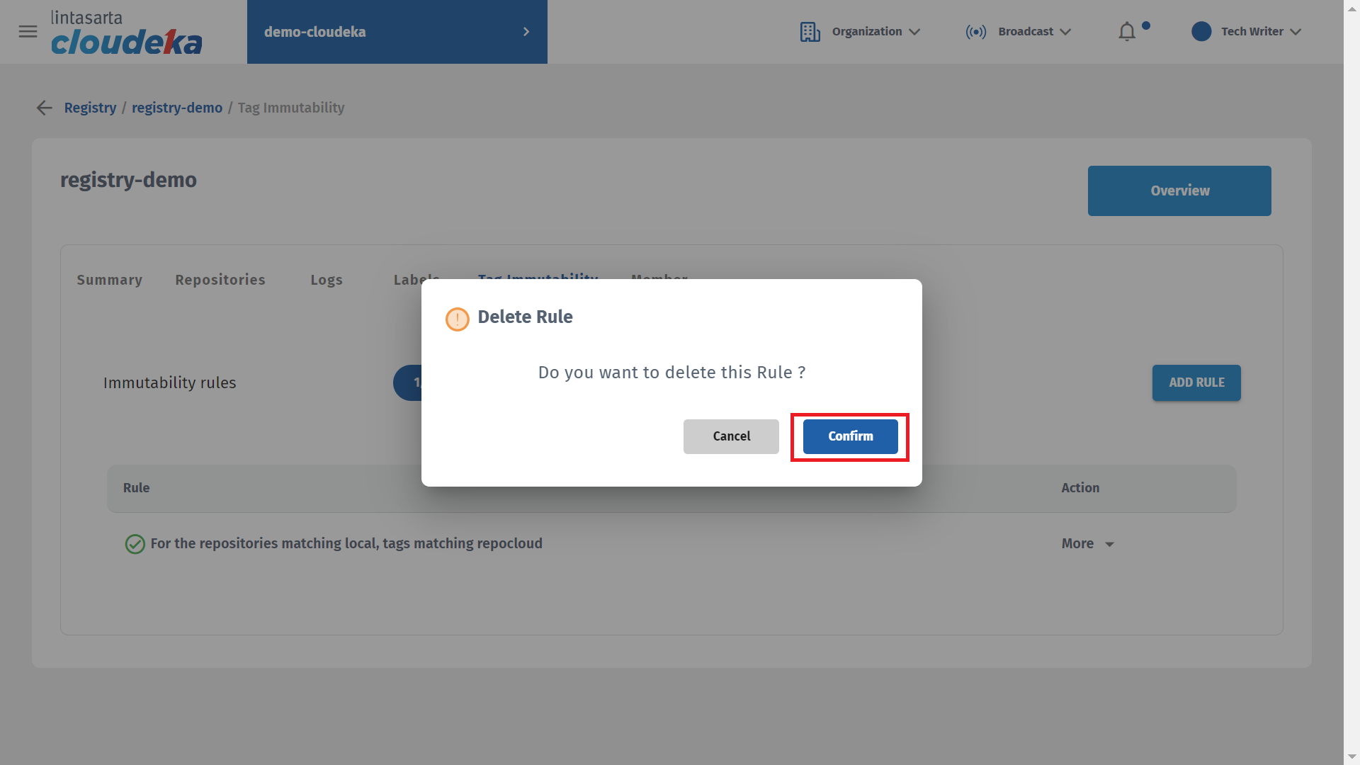 * The Delete Rule window displays click the Confirm button to continue with the process.