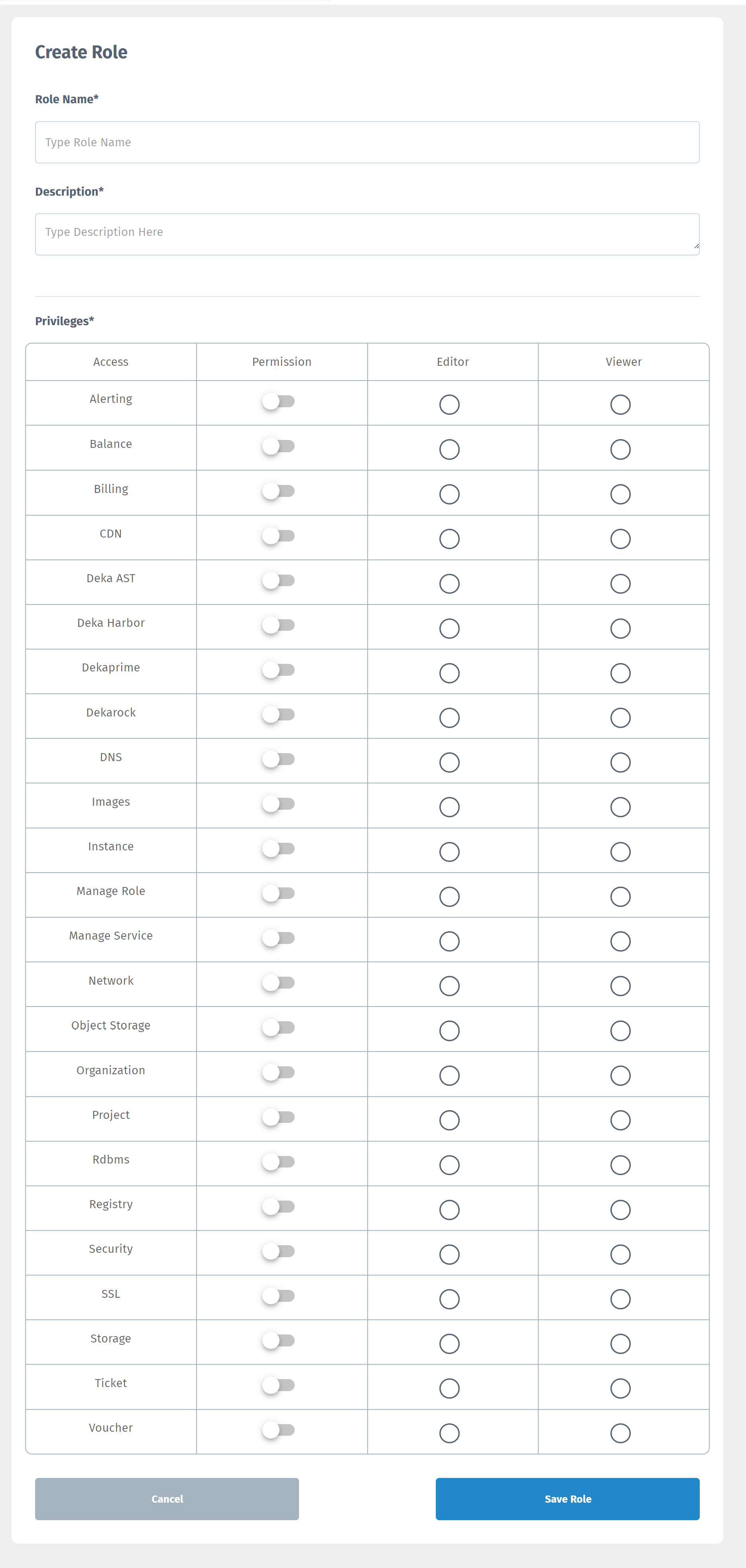 <figure><img src="https://putri.box.cloudeka.id/cloudeka-assets/static/images/1serviceportal/1.34%20Form%20Create%20Role.png" alt=""><figcaption><p>Create Role</p></figcaption></figure>