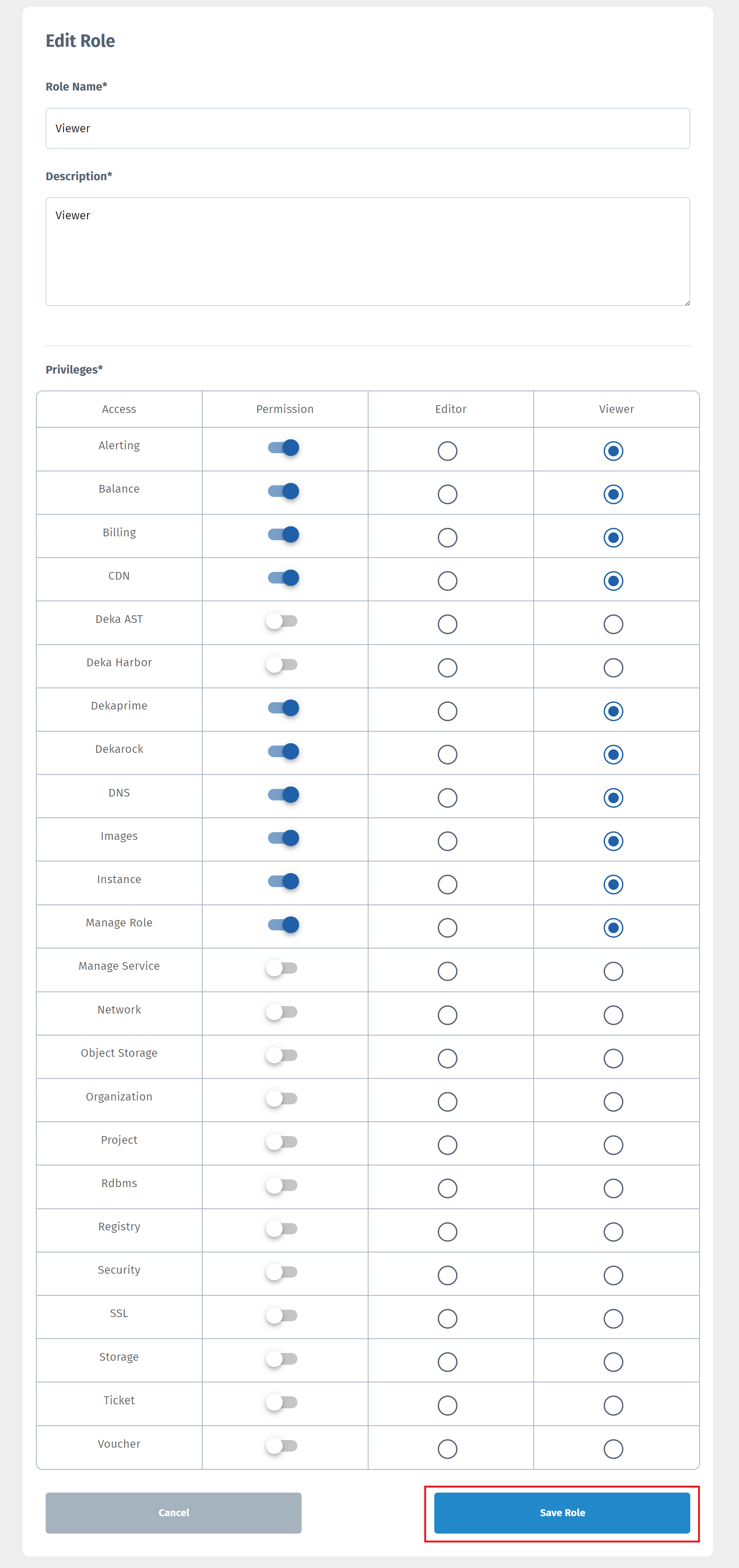If you have finished filling out the form, click the **Save Role** button to save or **cancel** if you don't want to create a role.