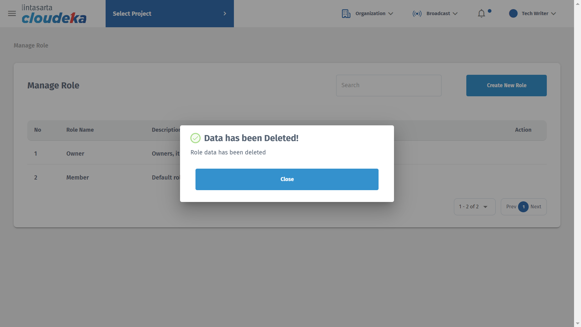 * A pop up will appear "Data has been deleted!. Role data has been deleted".