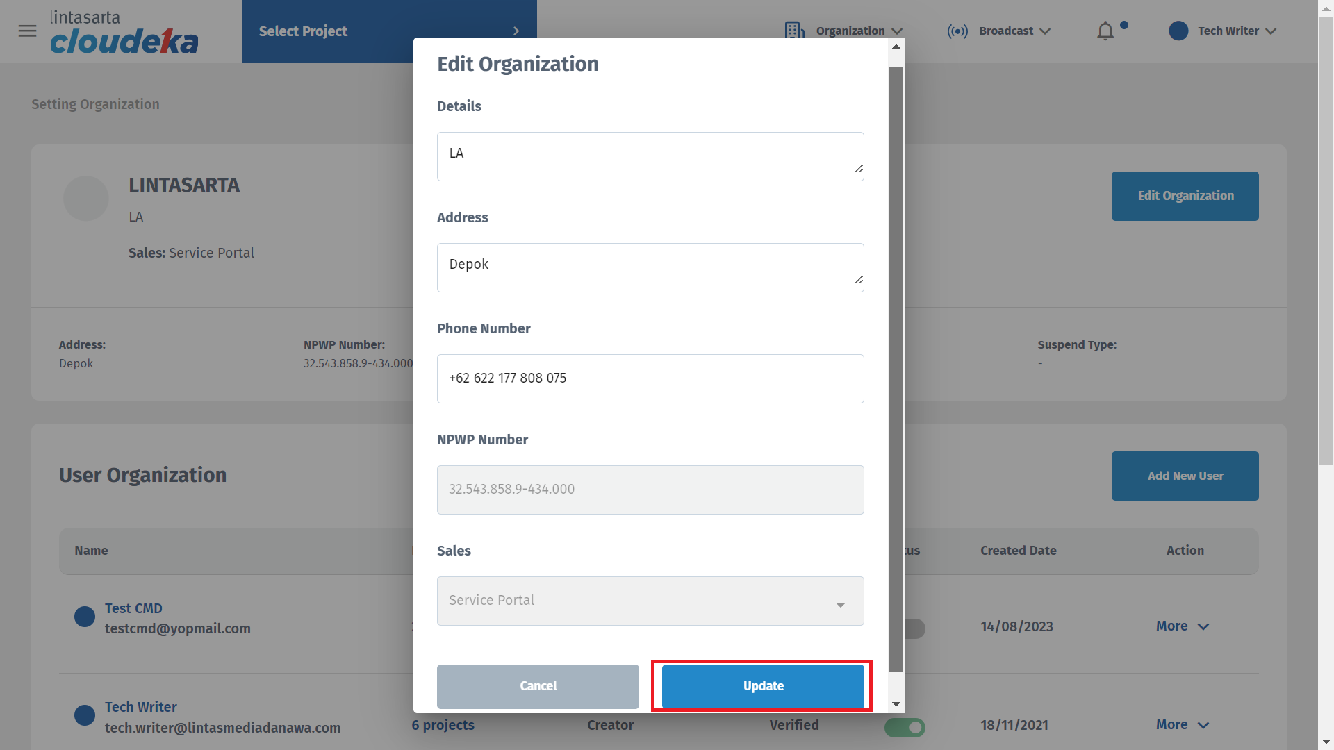 Then click the Update button if you want to save the data changes or click the Cancel button to return to the Setting Organization page without saving.