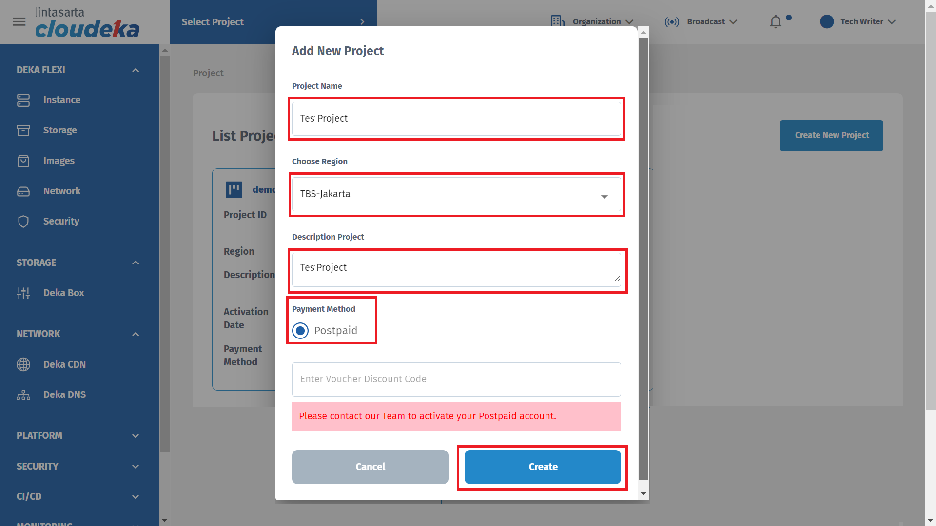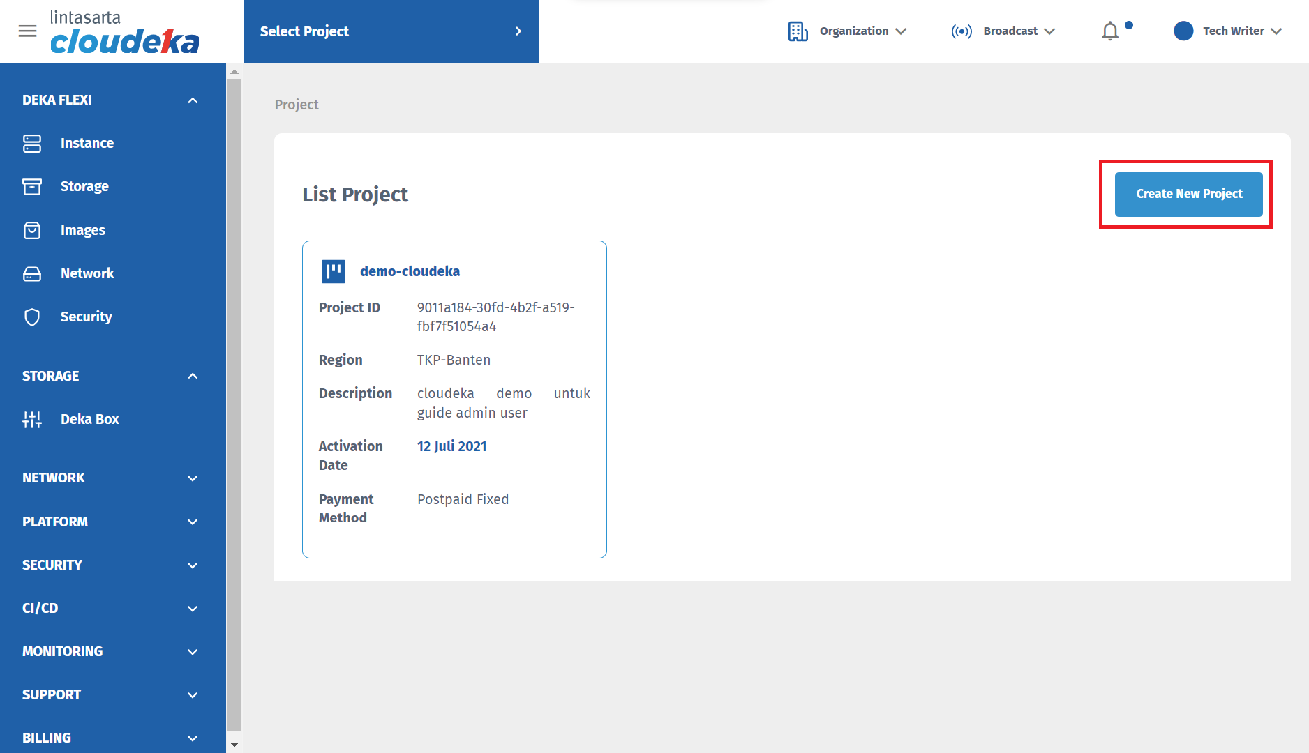 On this page, you can create a new project that will be registered in the Cloudeka application. Customers can create more than one project.