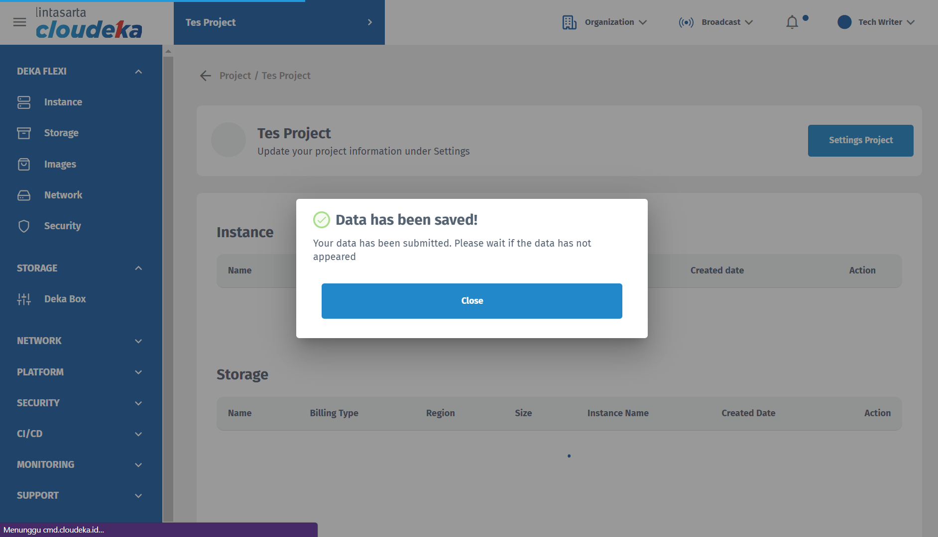 * If the new project has been successfully created, a pop up will appear **"Data has been saved! Your data has been submitted. Please wait if the data has not appeard".**