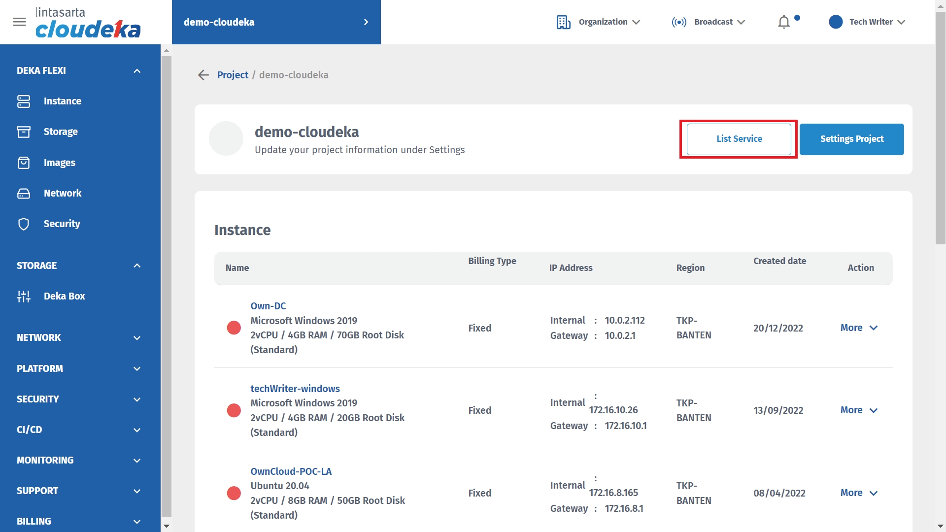 On project list page, click the project name that you want to see it service limit information. For example, click demo-cloudeka.