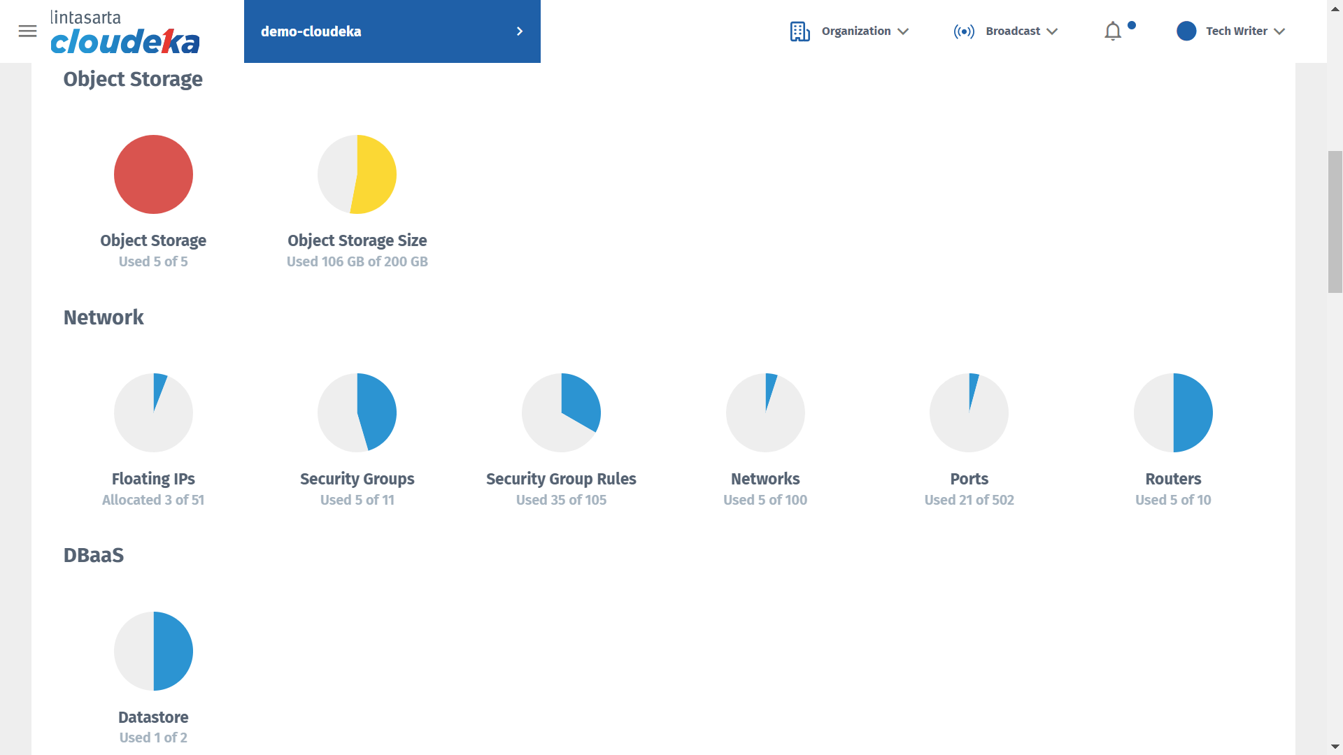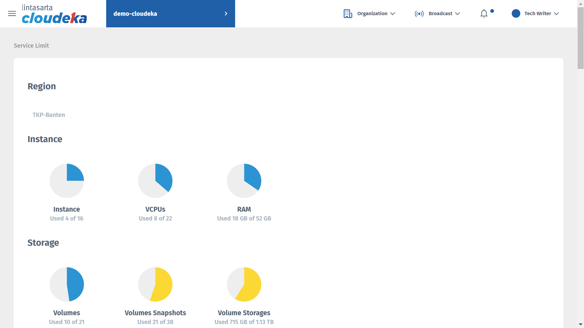 If you have been successfully create a project, you can see the information of project service limit. The service limit are usage status **Instance, Storage, Object Storage** and **Network**.