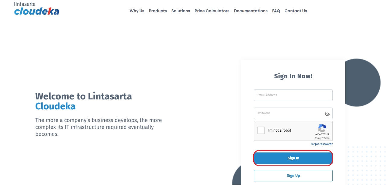 If you already have an account on the Service Portal Cloudeka, then all you need to do is access Cloudeka on your browser, it will open the Sign In Now! page. To Sign In, fill in the Email Address and Password fields that you registered earlier, then click the Sign In button.
