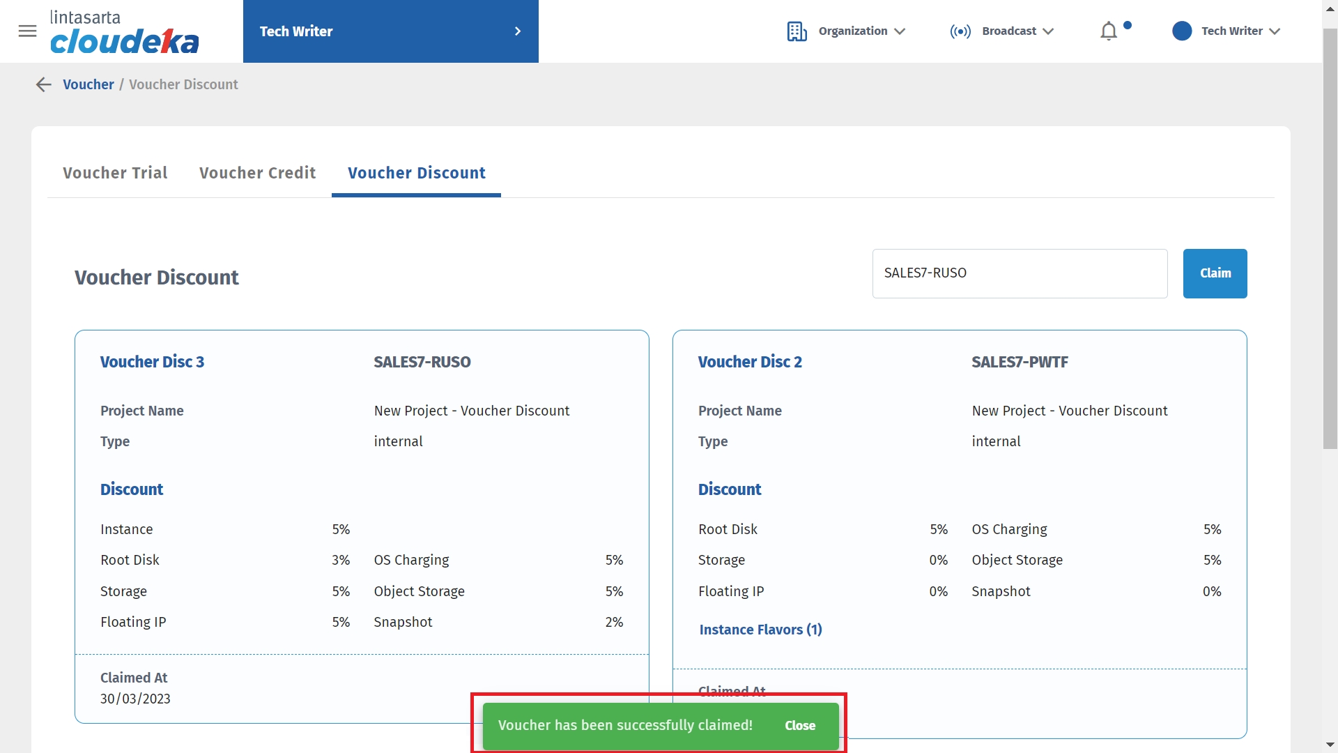 Show notification Voucher has been successfully claimed! that vouchers can already be used by project Tech Writer.