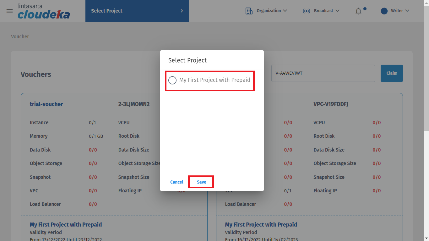 The Select Project pop-up appears, select the project that will use the voucher then click Save.
