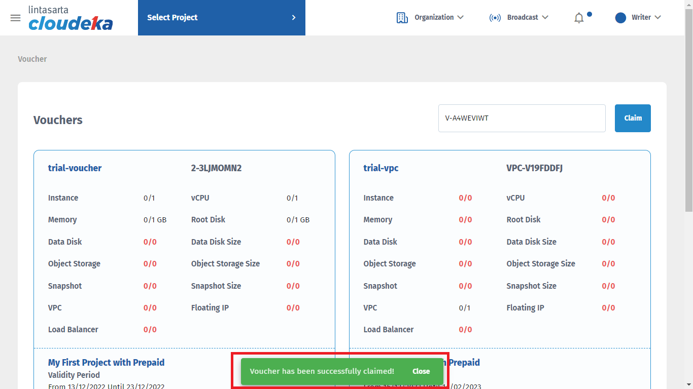Voucher has been successfully claimed! that the voucher has been successfully claimed and can be used by the My First Project with Prepaid project.