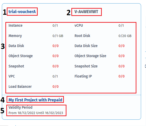 The voucher can already be used. You can see the voucher that has been claimed. You have a service Instance, vCPU, Memory, Root Disk Size, and VPC.