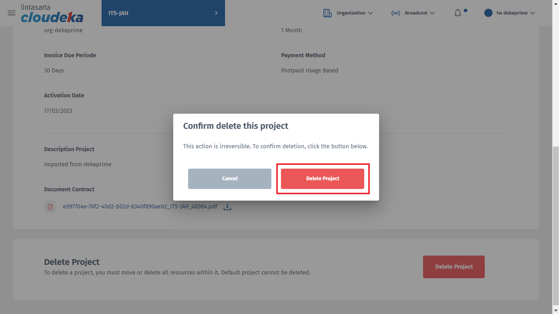 Show the "Confirm delete this project" window click Delete Project.