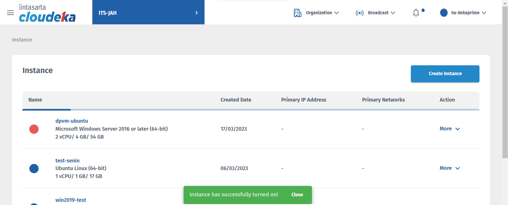 -"Instance has successfully turned on!"" notification, which means that the instance was successfully activated.