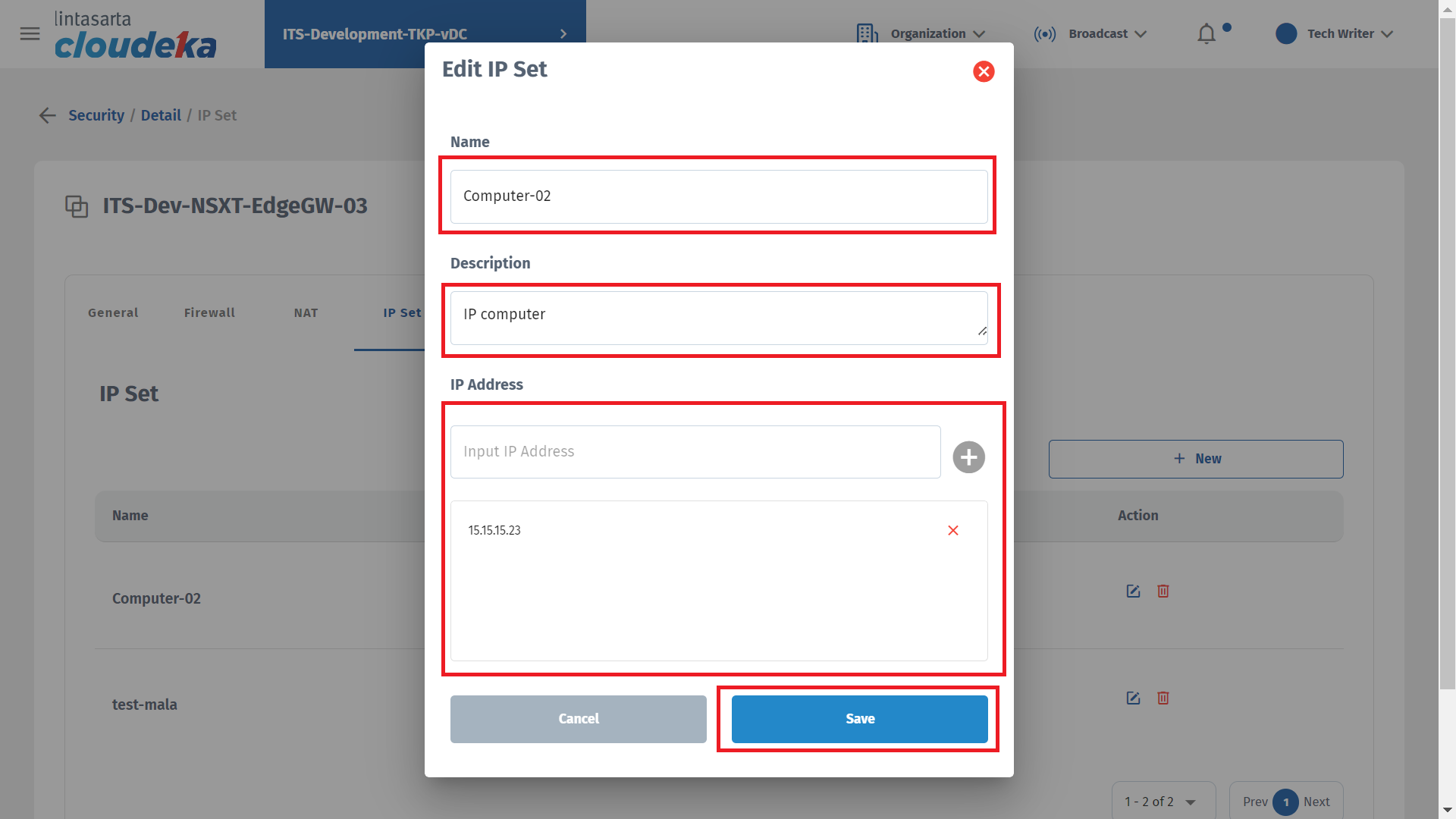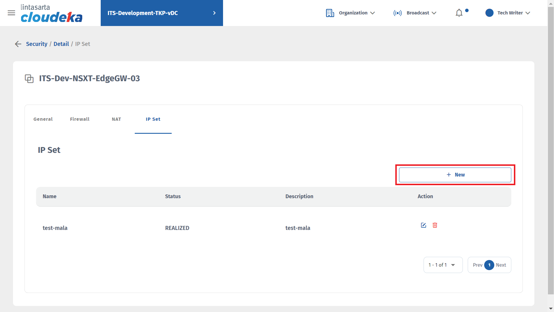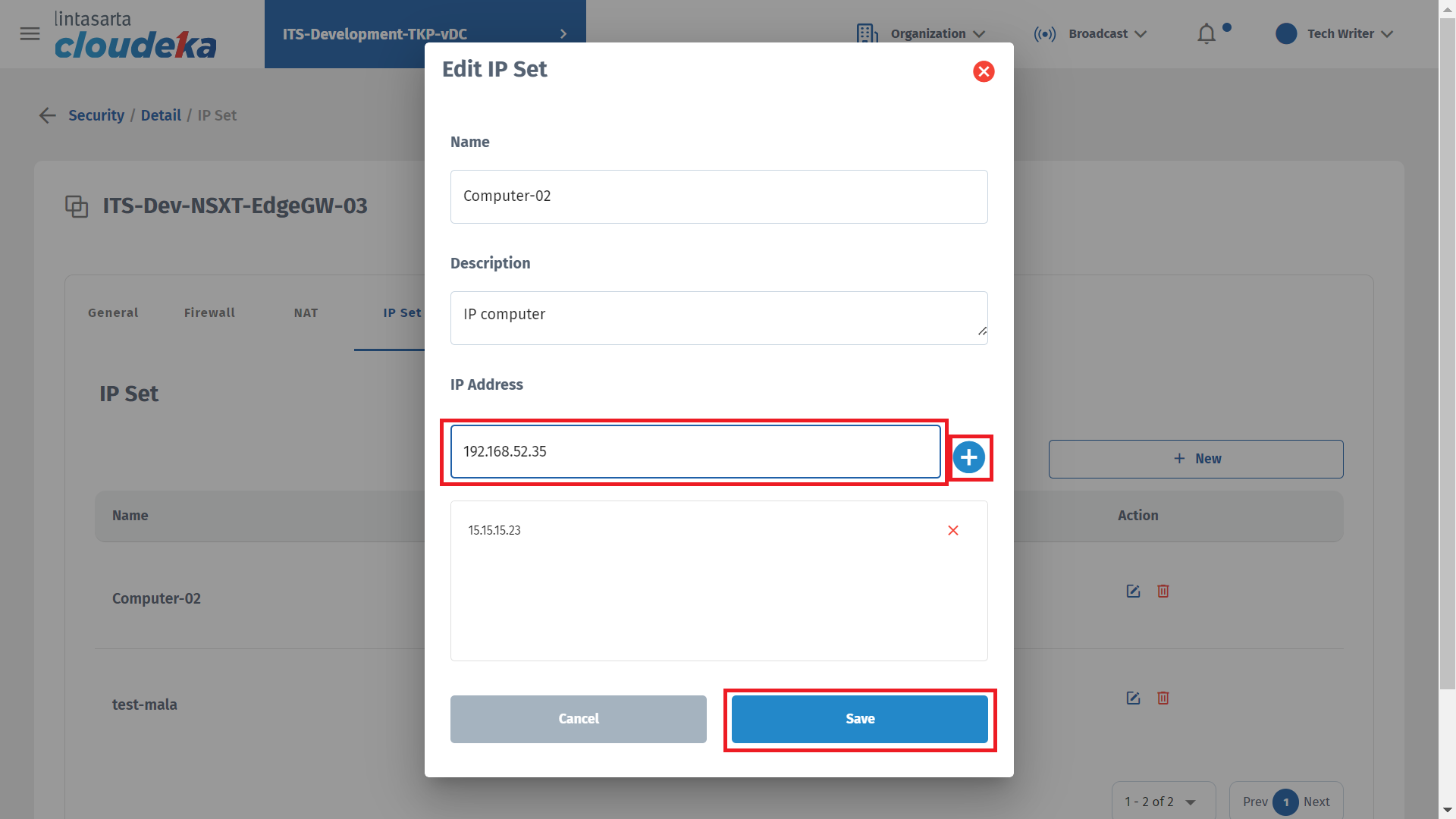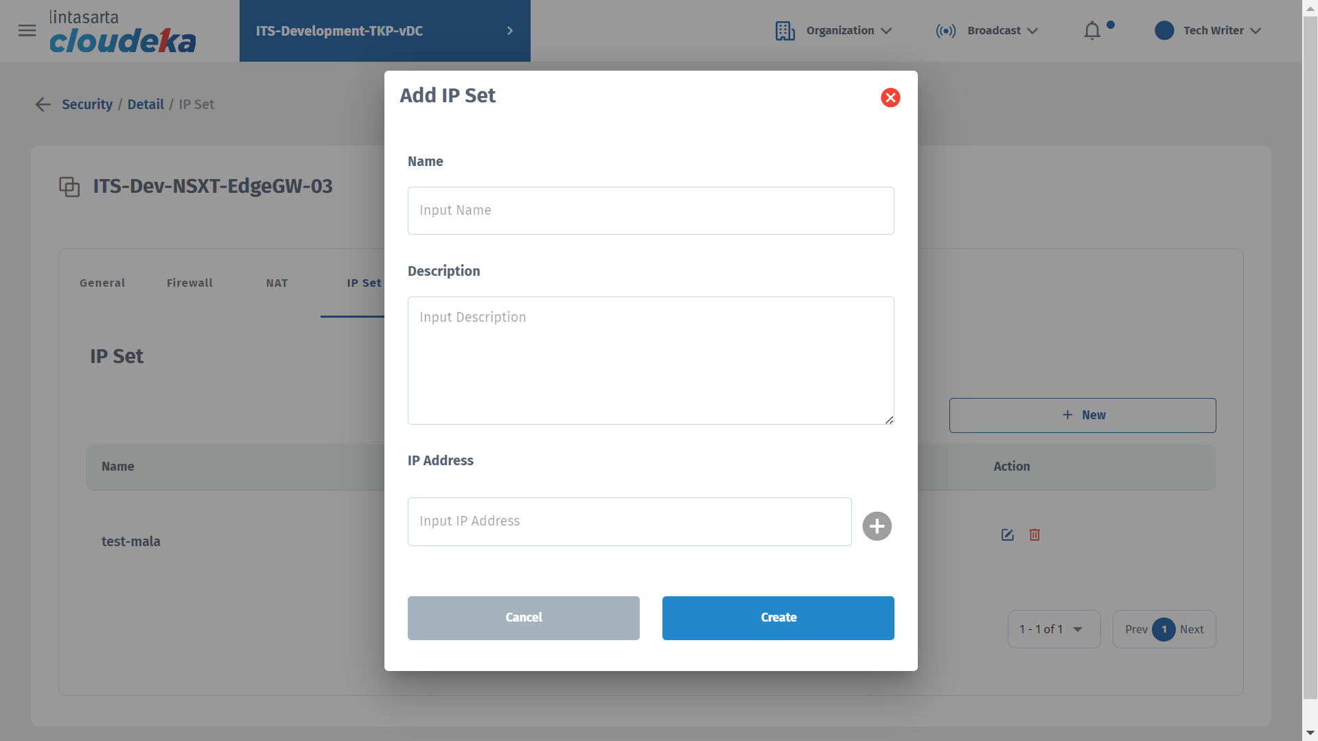 On the IP Set tab you can add IP that can access Deka Prime, update IP Set data, and delete IP sets that have been configured. This tab is only available if you use the NSXT edge type during edge conf