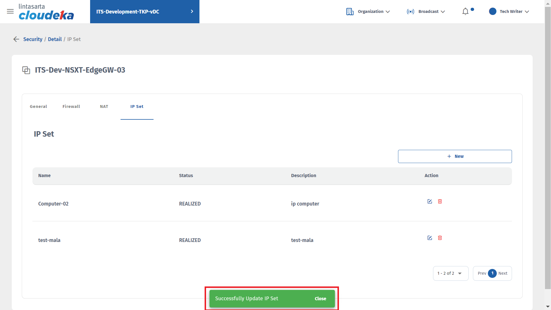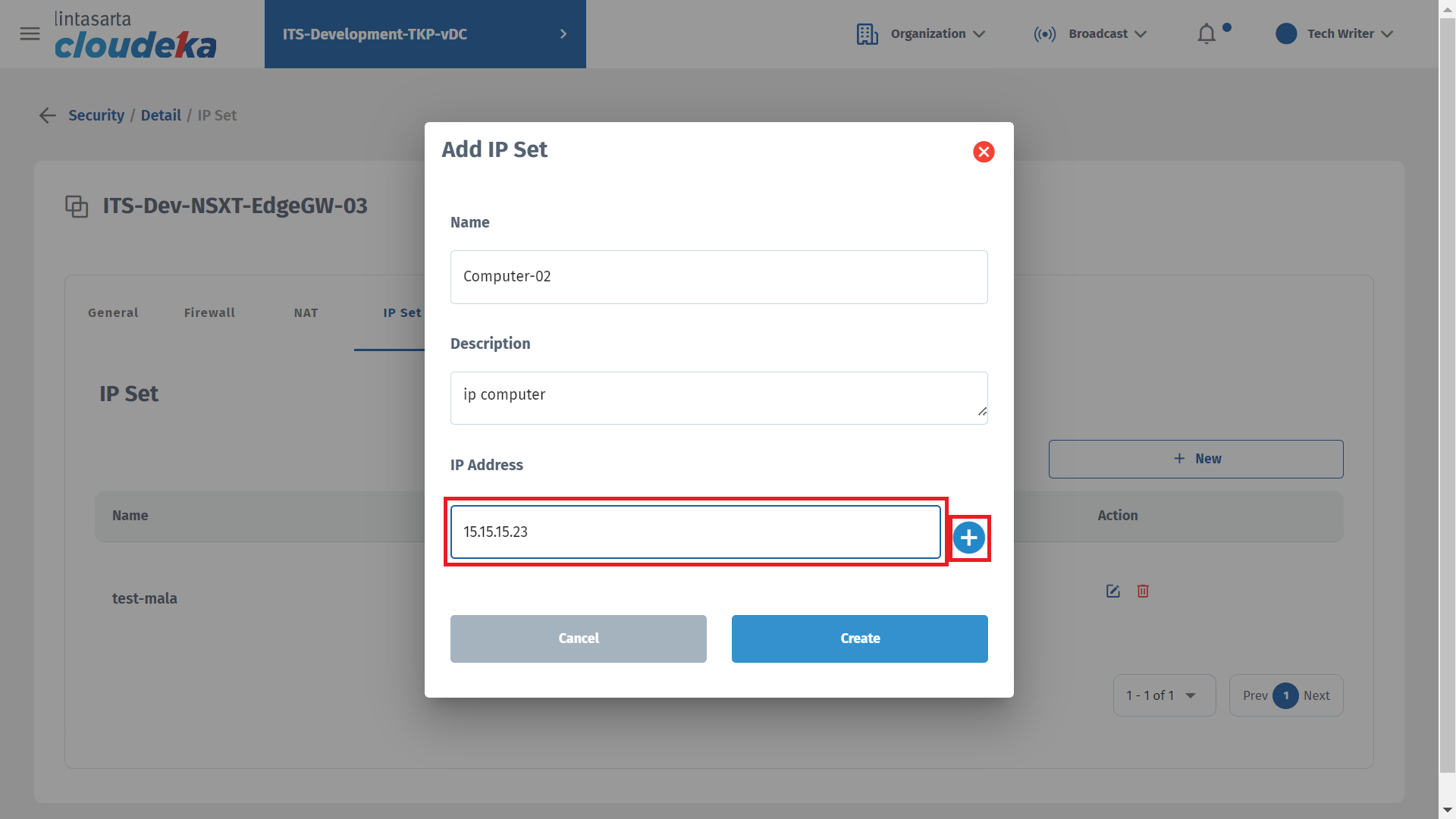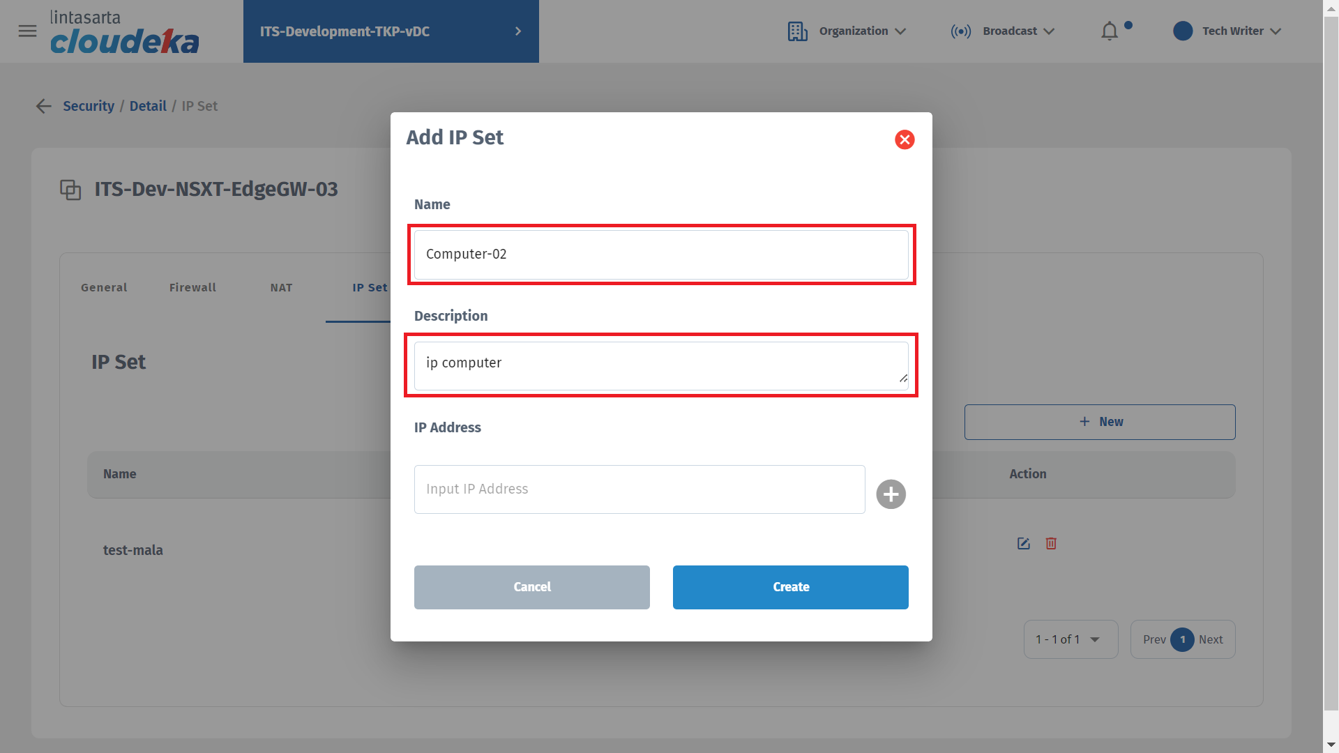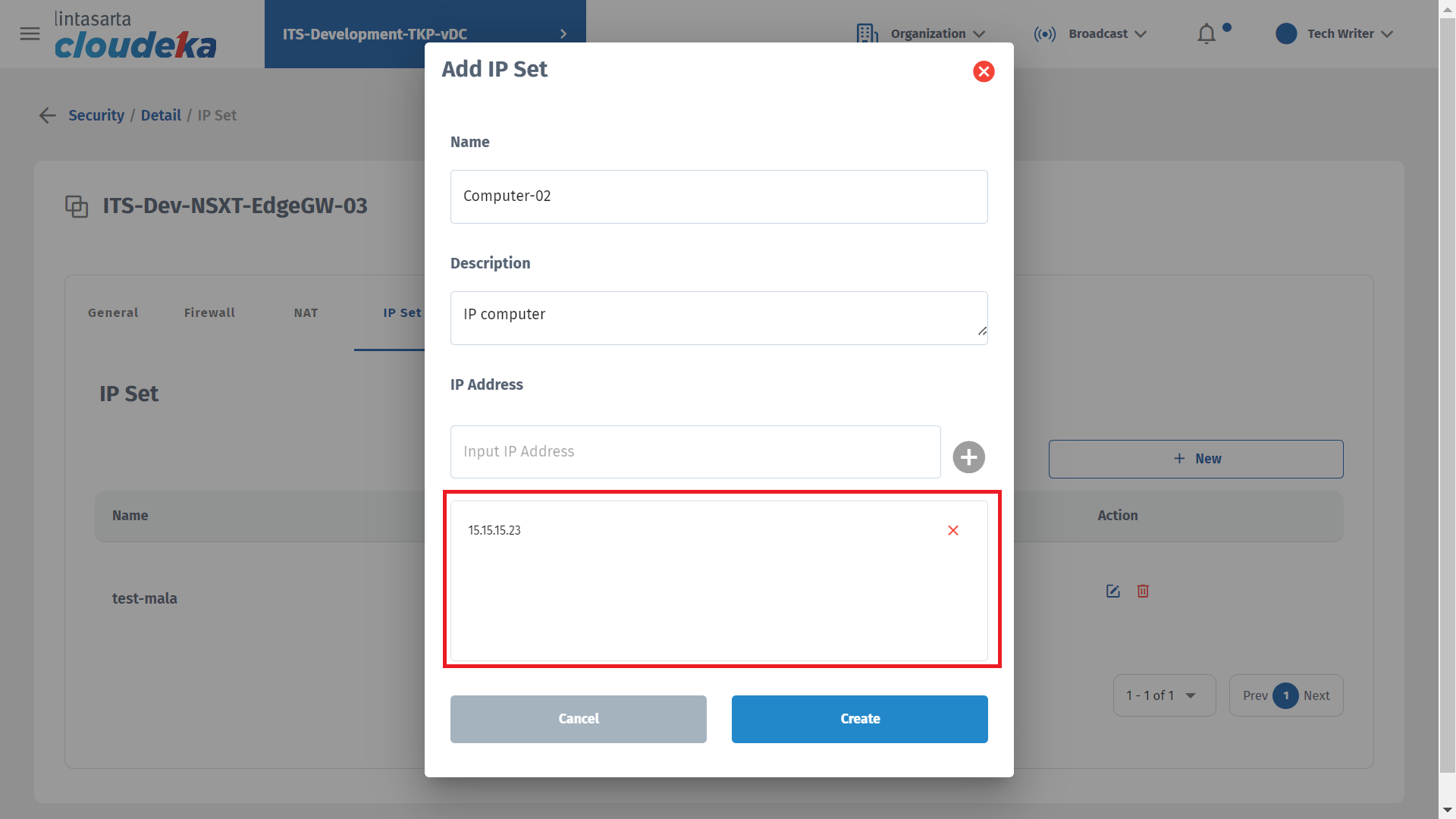 On the IP Set tab you can add IP that can access Deka Prime, update IP Set data, and delete IP sets that have been configured. This tab is only available if you use the NSXT edge type during edge conf