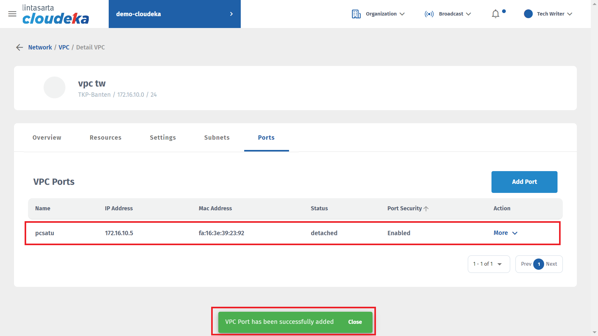 * A notification "VPC port has been successfully added" appears and the port is available in the VPC Port list.