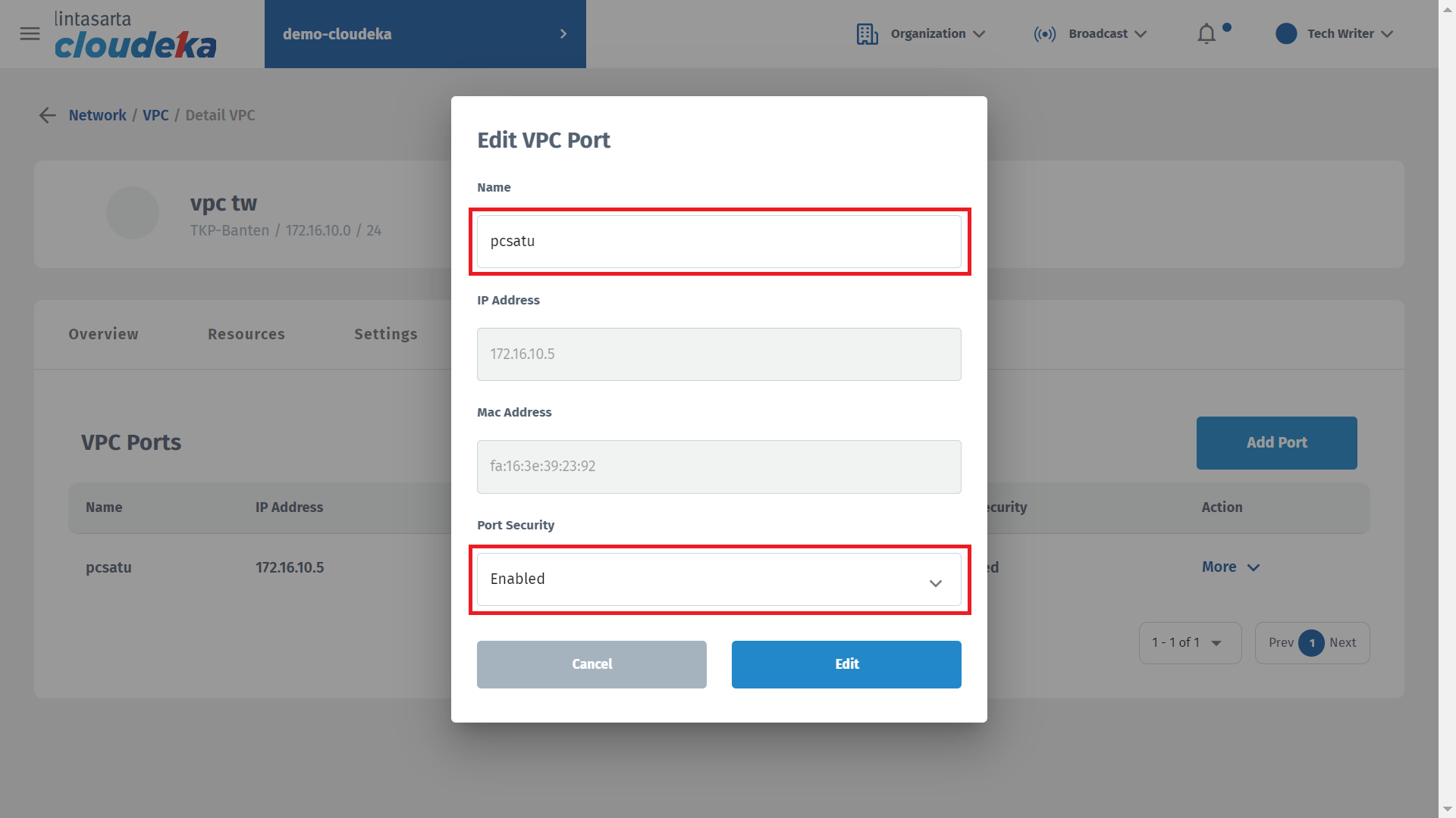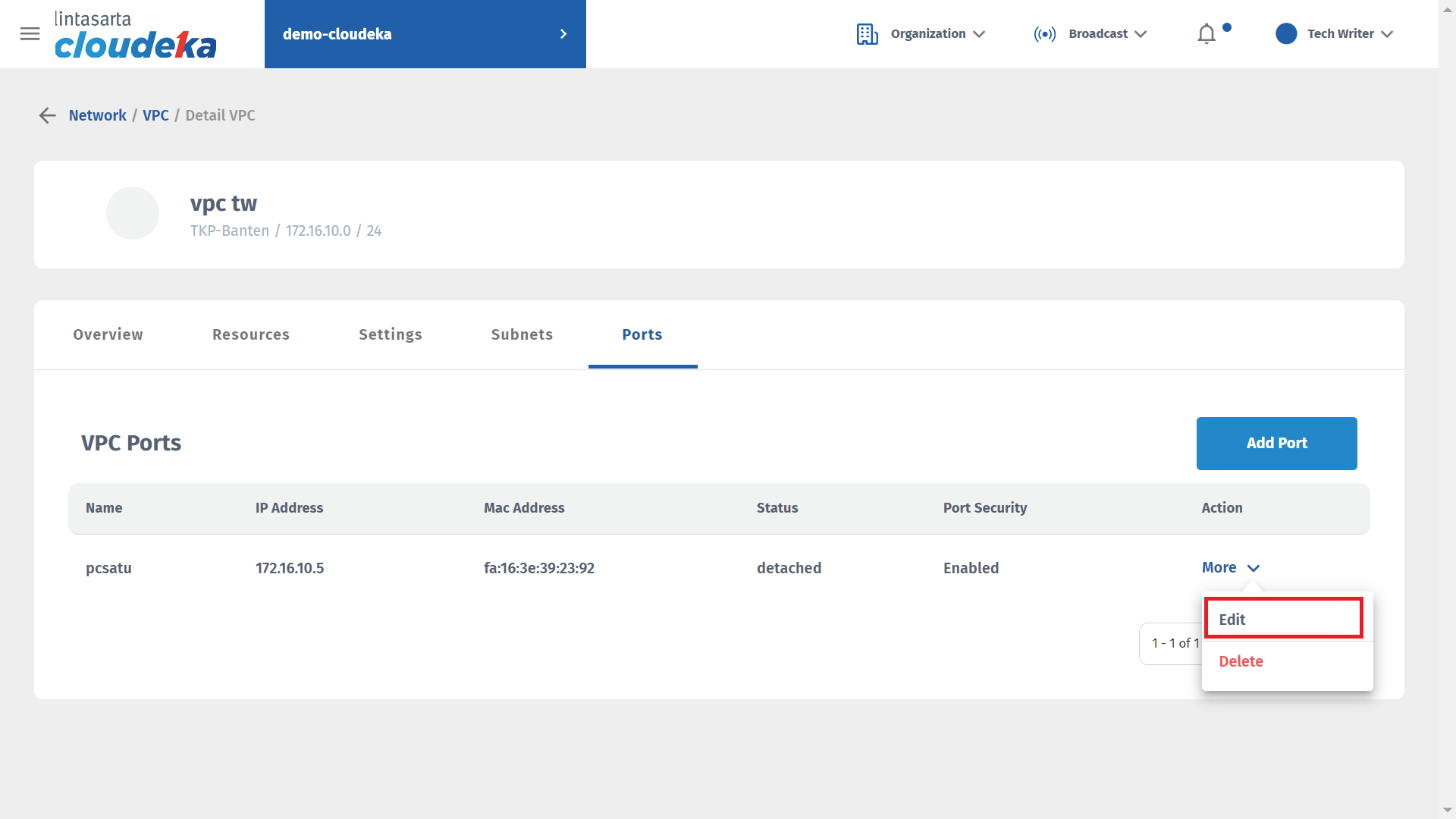 To be able to update the data used by the port on the VPC Details page, press the More button and select Edit.