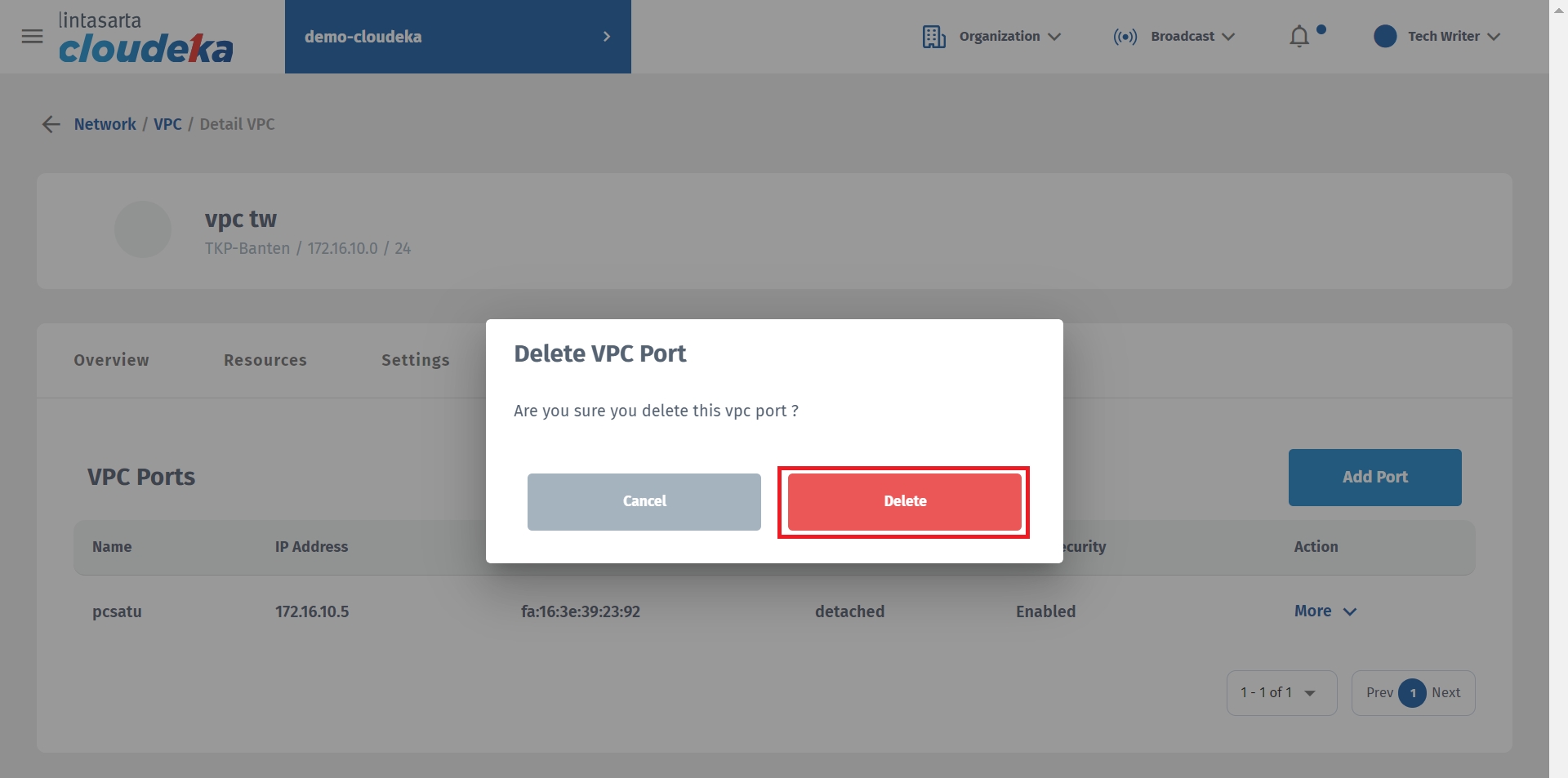 On the Ports tab on the VPC Details page press the Delete button in the More column.