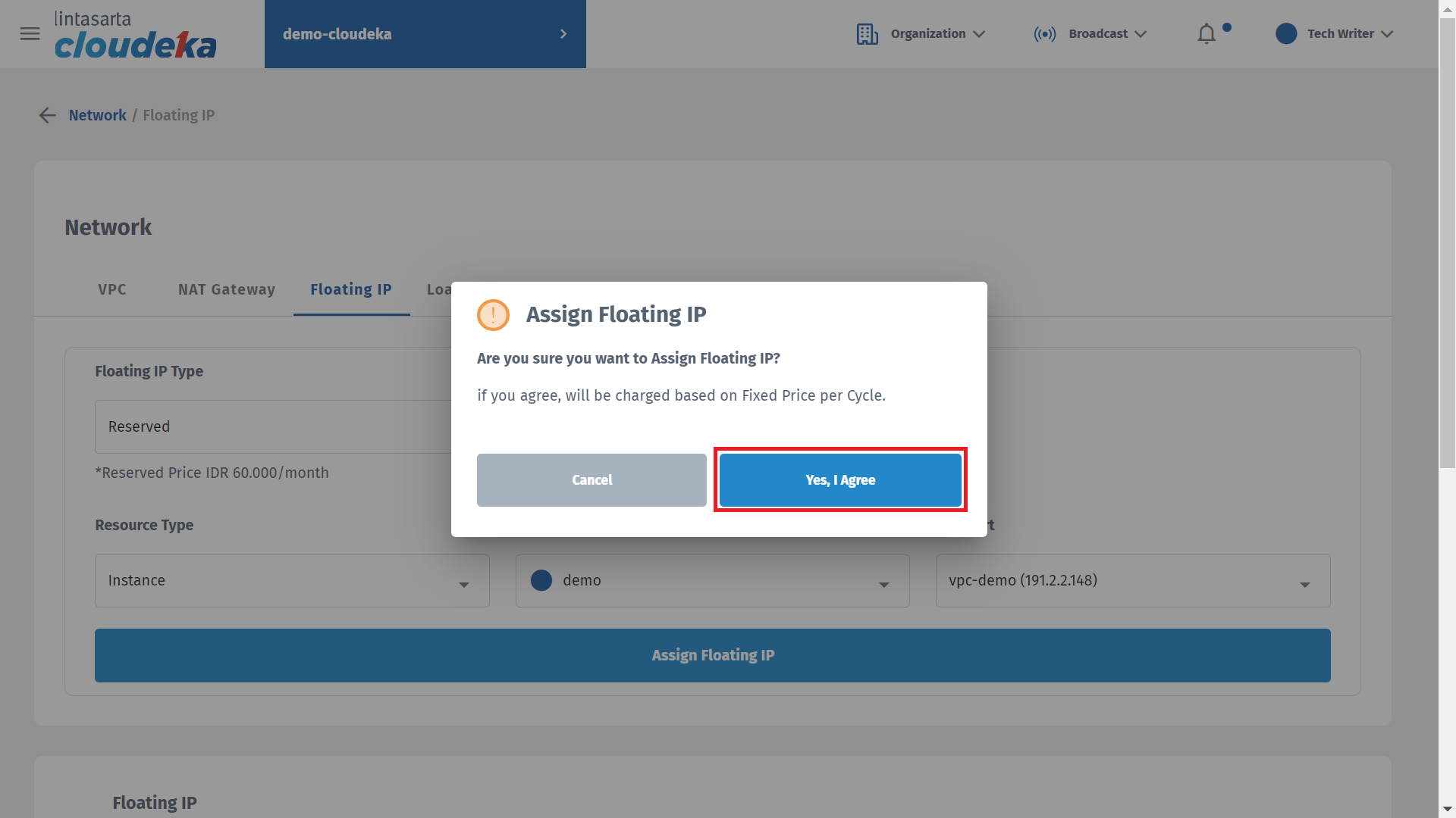 * The Assign Floating IP window appears, press the Yes, I Agree button to continue the process.