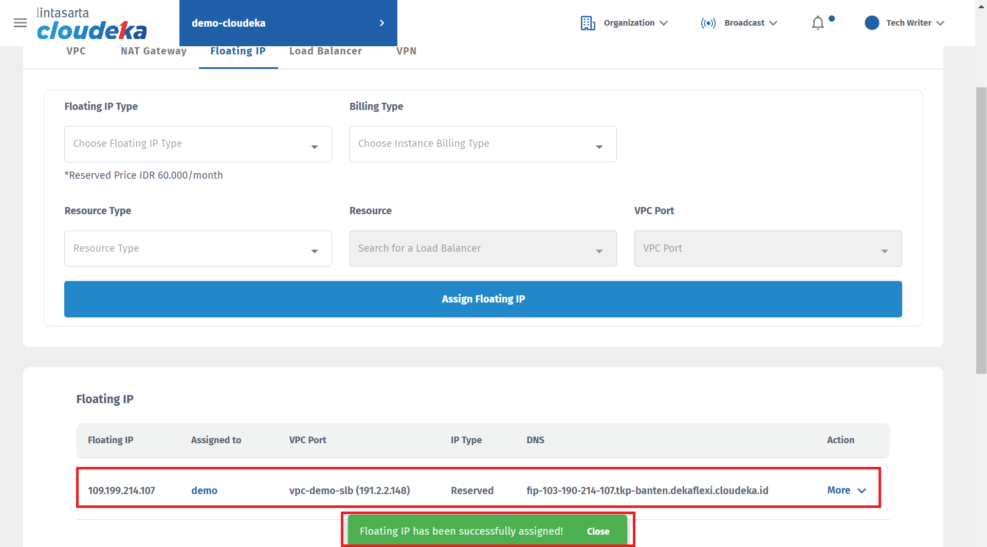 * In **Floating IP Type**, there are two Floating IP Types, namely **Reserved** and **Non Reserved**. In the **Non-Reserved** type when you **Reassign Instance** then the IP used will be deleted from the list in the Floating IP, while in the **Reserved** type if you **Reassign Instance** then the IP used will remain on the list in Floating IP so you can use the IP for other instances of your project.