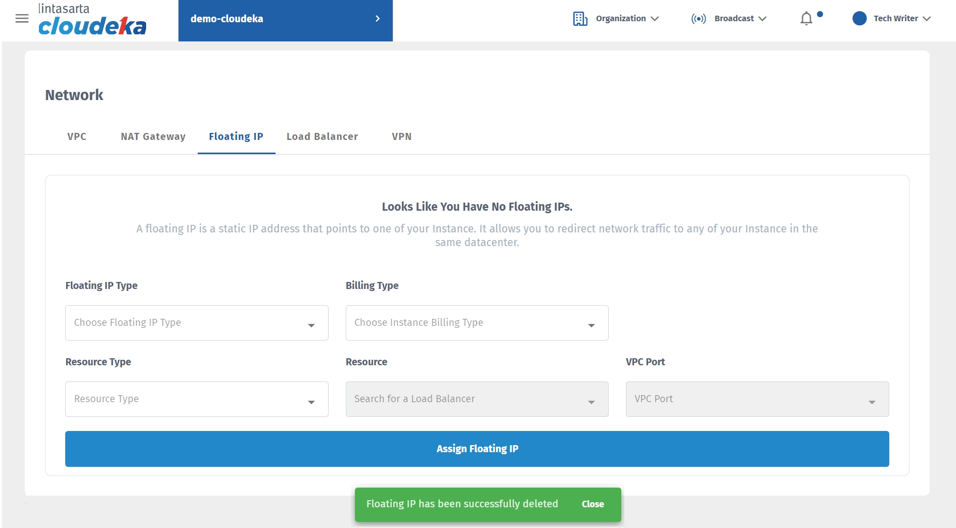 - If the Floating IP has been successfully deleted, a pop up will appear "Floating IP has been successfully deleted".