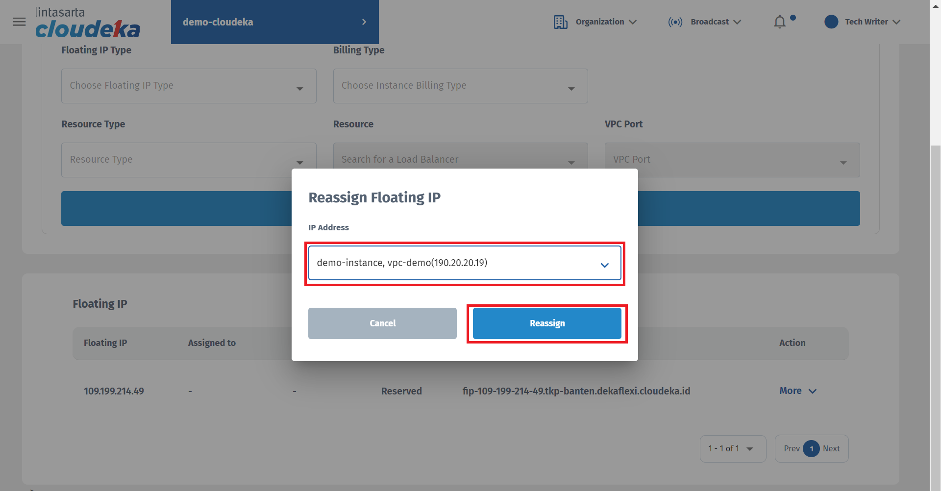 * The Reassign Floating IP window appears, in the IP Address column select the VM and VPC that will add the Floating IP and press the Reassgin button.