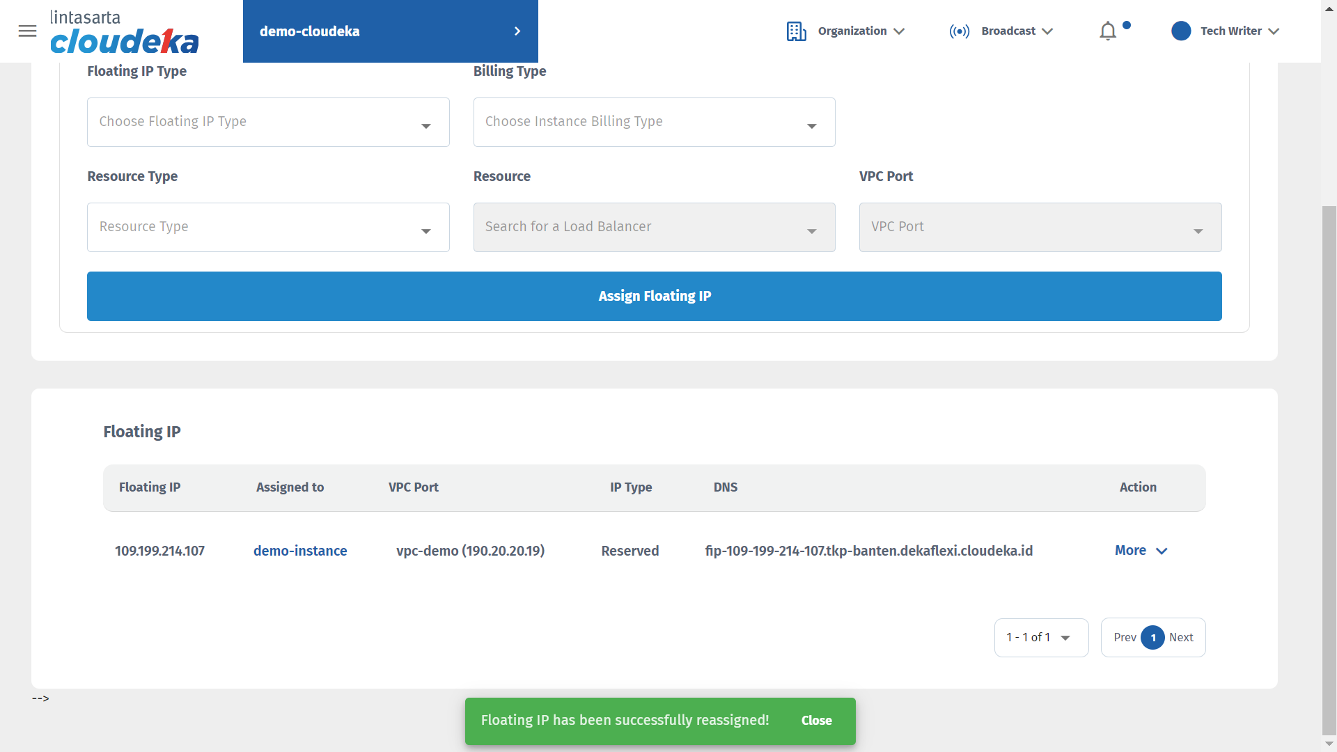 * Wait until the process is complete and the notification "Floating IP has been successfully reassigned" appears.