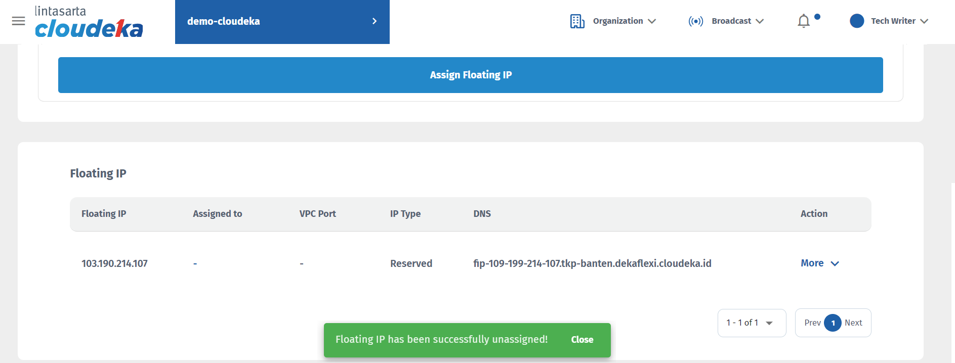 * If the Floating IP has been successfully unassigned, a pop up will appear **"Floating IP has been successfully unassigned!".**