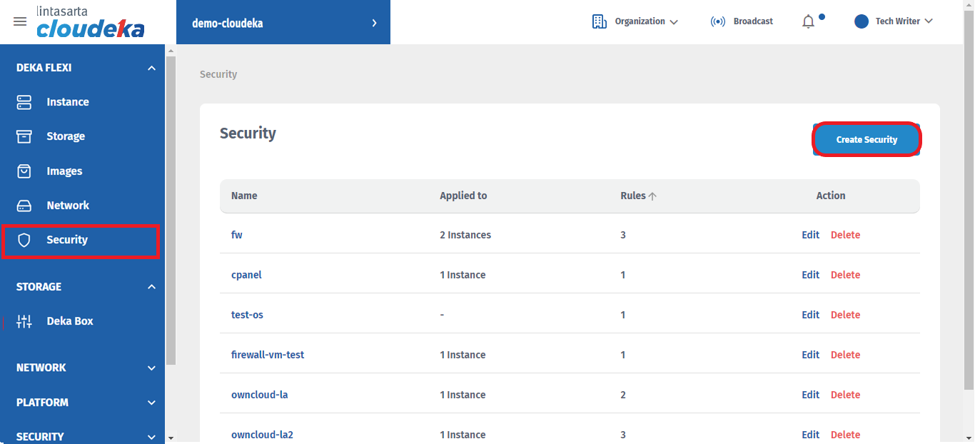 On your Cloudeka Portal, select the Security menu then click the Create Security button.