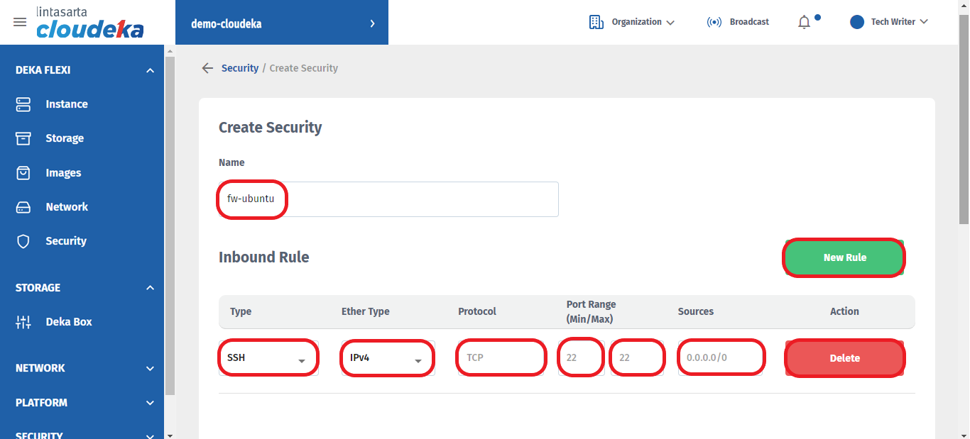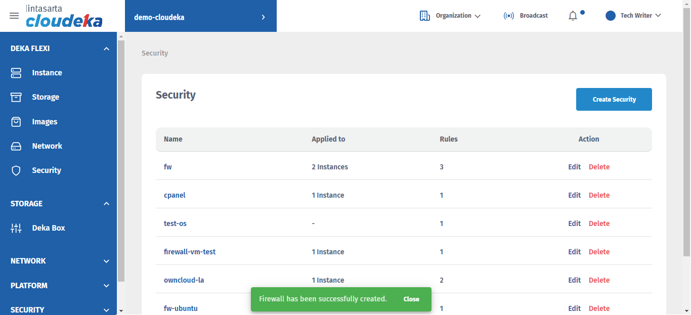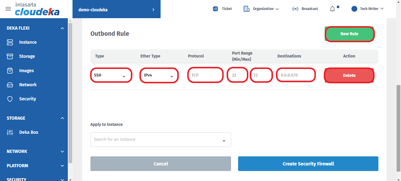 Click Delete button to delete the security. Select Apply to Instance (for the instance where Security is created), Click the Save button if you want to continue creating the firewall or Cancel if you don't want to continue the process.