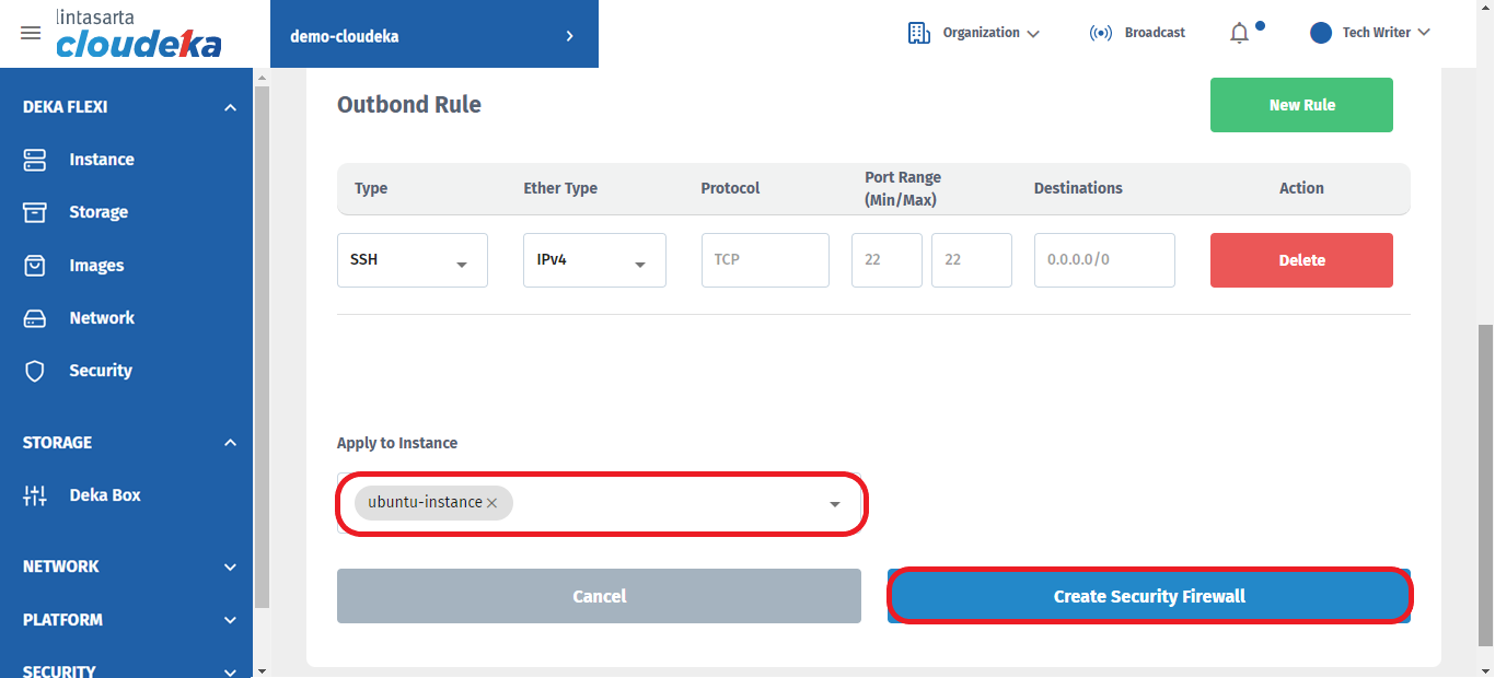 Before creating a Security Firewall Rule, you must first have an Instance. If you don't have an Instance yet, you can deploy an Instance in Create VM Instance