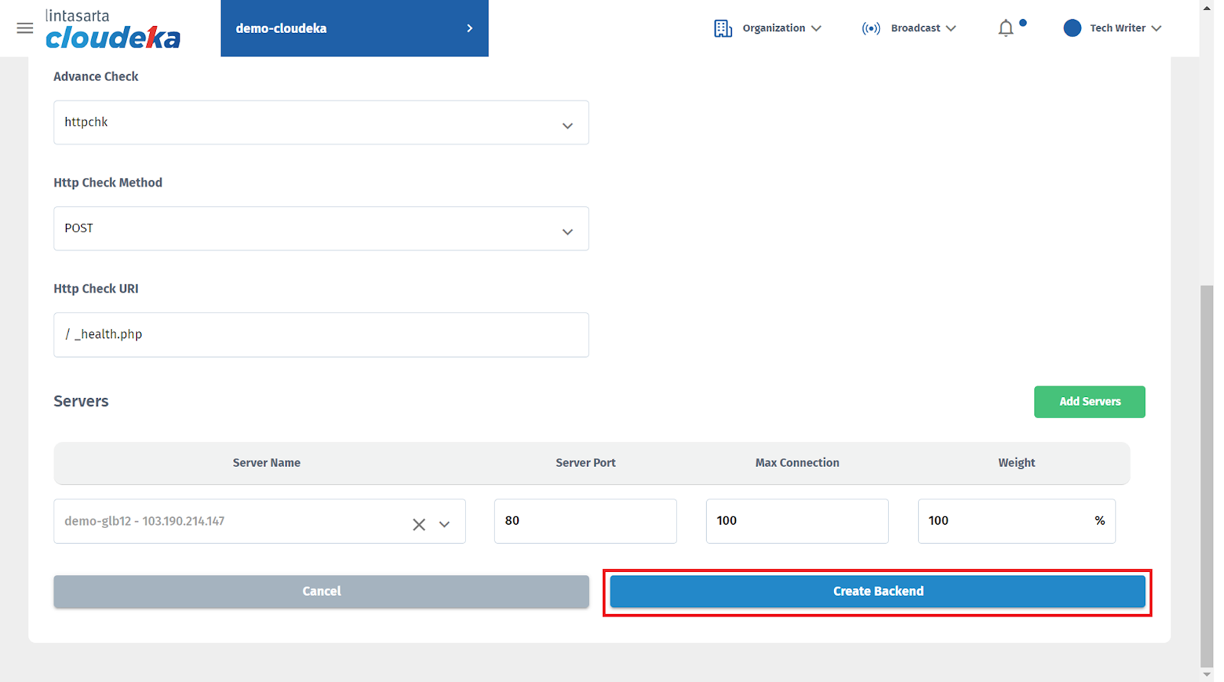 The Edit Backend page, the only things that can be changed are the Load Balance Method, Advanced Check, Http Check Method, Http Check URI, and you can add Servers by clingking Add Servers. Then click Update Backend.