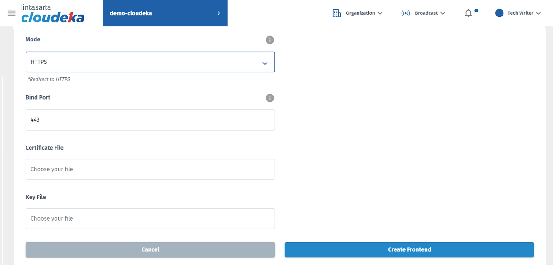 The Create Frontend page appears, fill in the form provided.