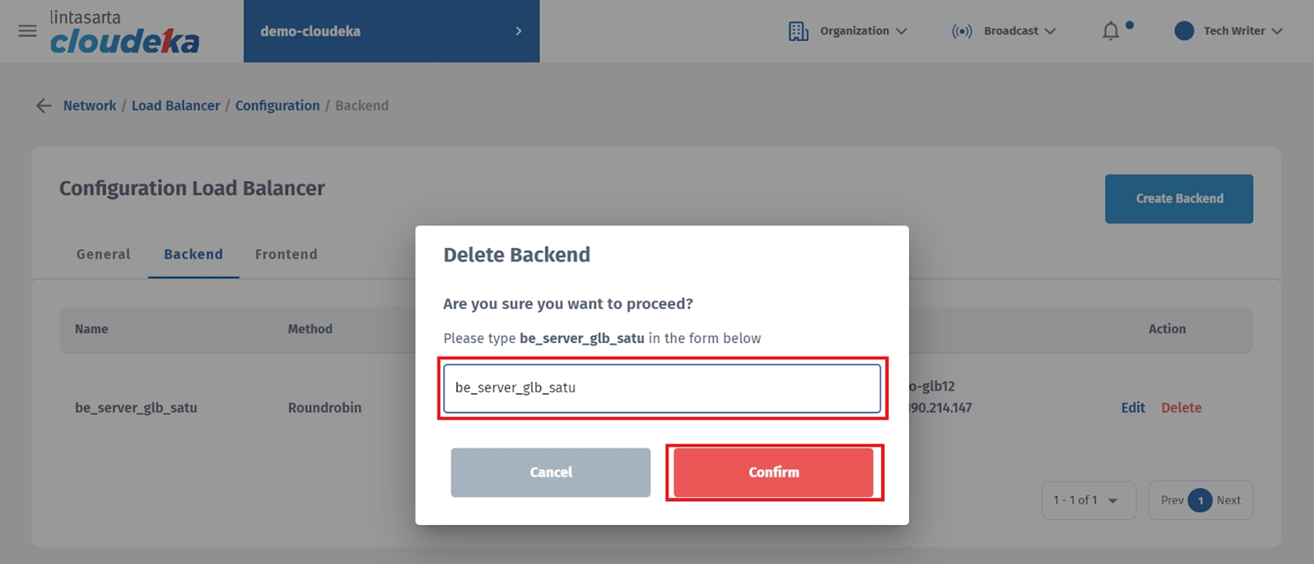 The Delete Backend window appears, enter the frontend configuration name and press the button Confirm to continue the configuration deletion process.