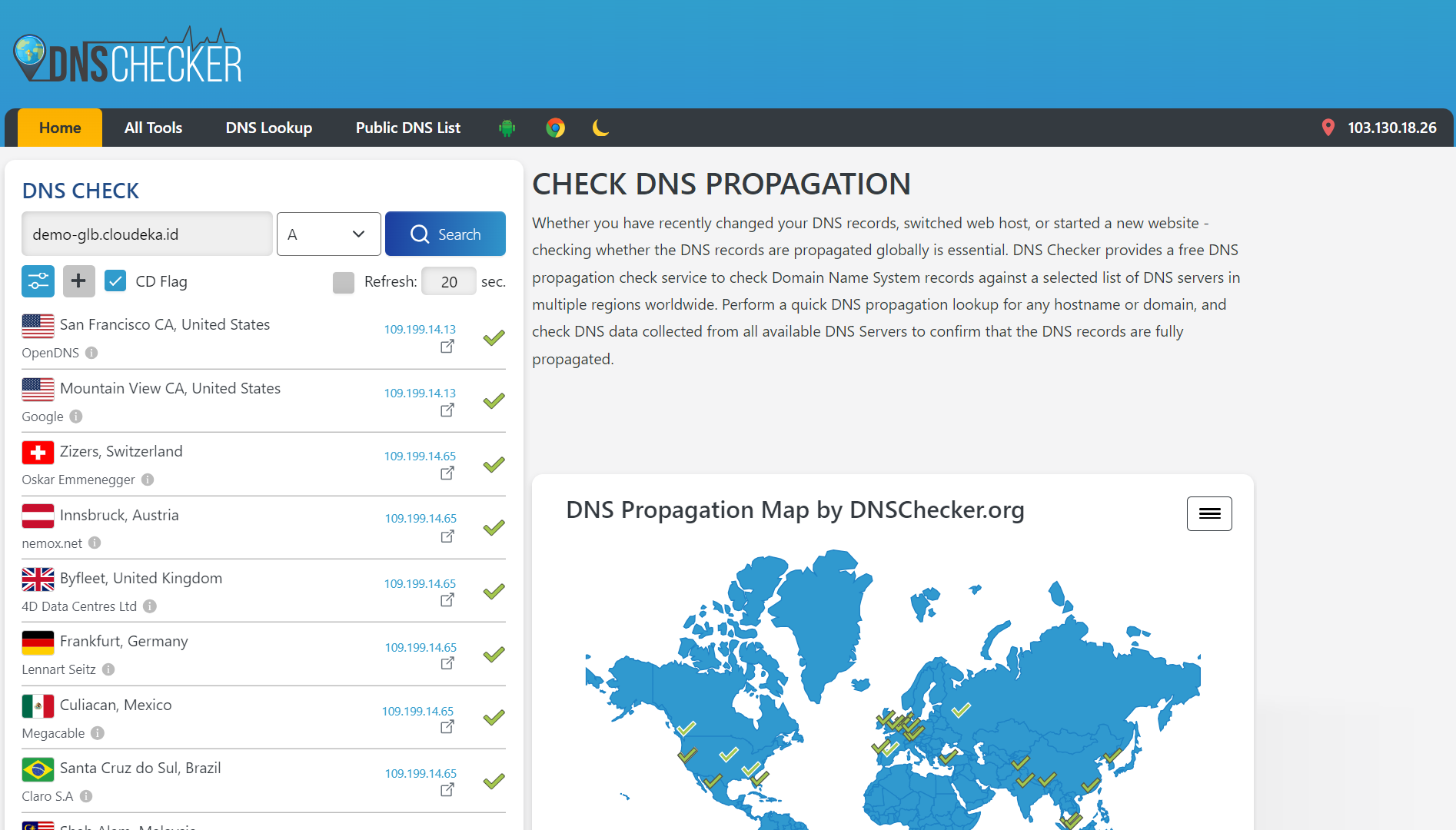 After entering the DNS configuration by the Cloudeka Team with an example domain **demo-glb.cloudeka.id**. To ensure the configuration used is appropriate, you can check via **dnschecker.org**. On website **dnschcker.org** used to check the extent to which DNS configuration changes have propagated across DNS servers in various locations.