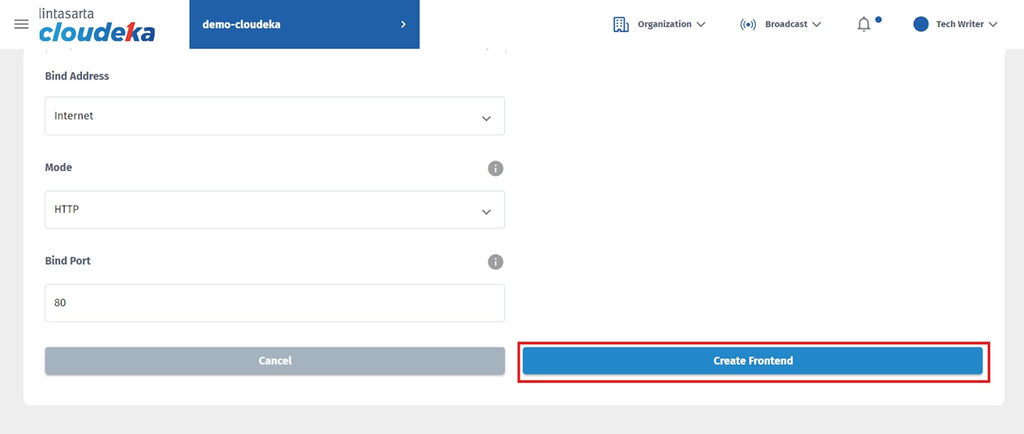 On the Configuration Load Balancer page click on the Frontend tab, and then click Create Frontend.