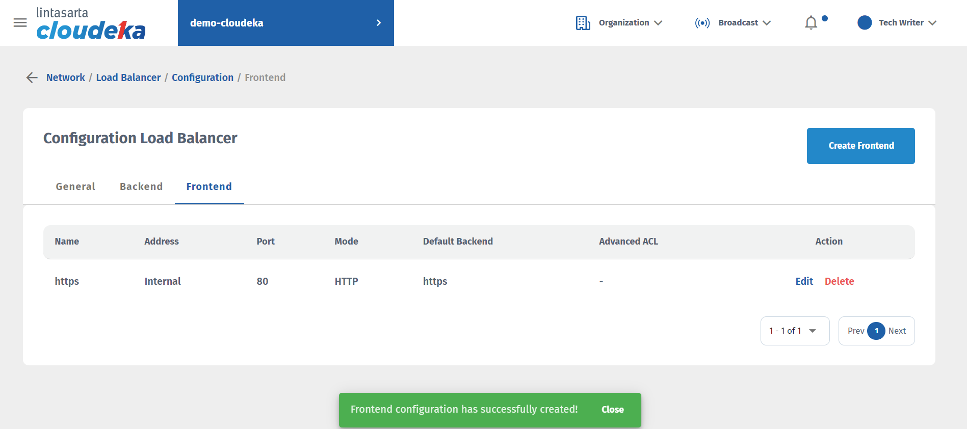 If the HTTPS load balancer frontend is successfully created, a notification will appear “Frontend Configuration has successfully created!”.