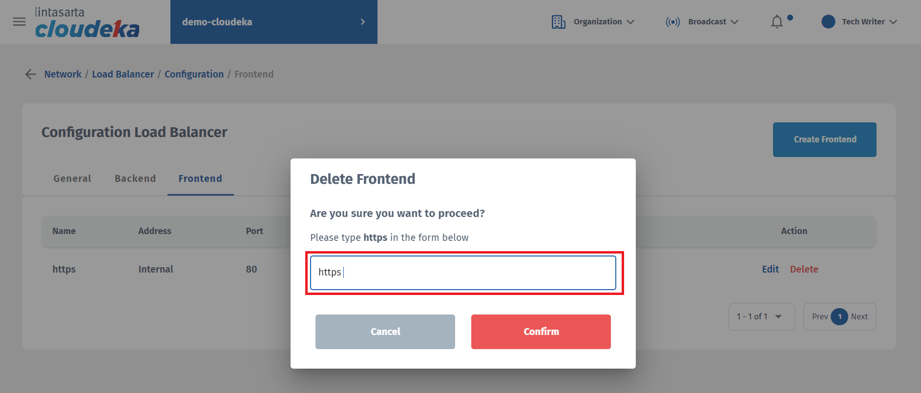 The Delete Frontend window appears, enter the frontend configuration name and click the Confirm button to continue the configuration deletion process.