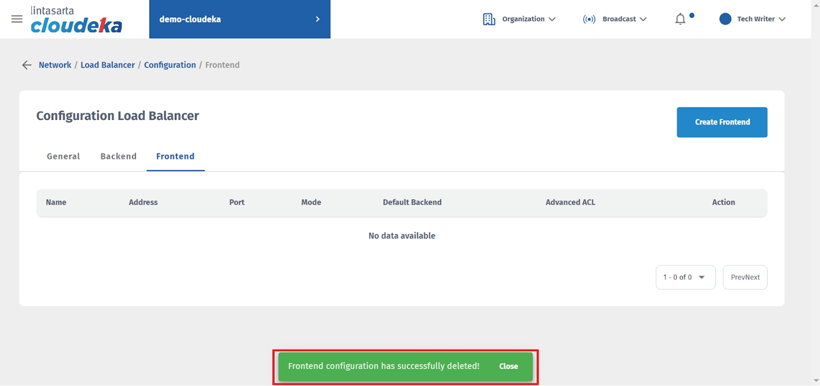 A notification will appear Frontend Configuration has successfully updated! indicating that the frontend Load Balancer configuration has been successfully modified.