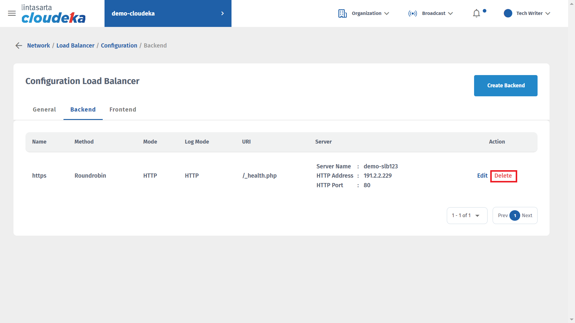 After successfully deleting the frontend configuration, the next step is to delete the backend configuration. If you haven't deleted the frontend configuration, a notification will appear "Please detach default backend from frontend configuration!" On the Backend tab, select the Delete button.