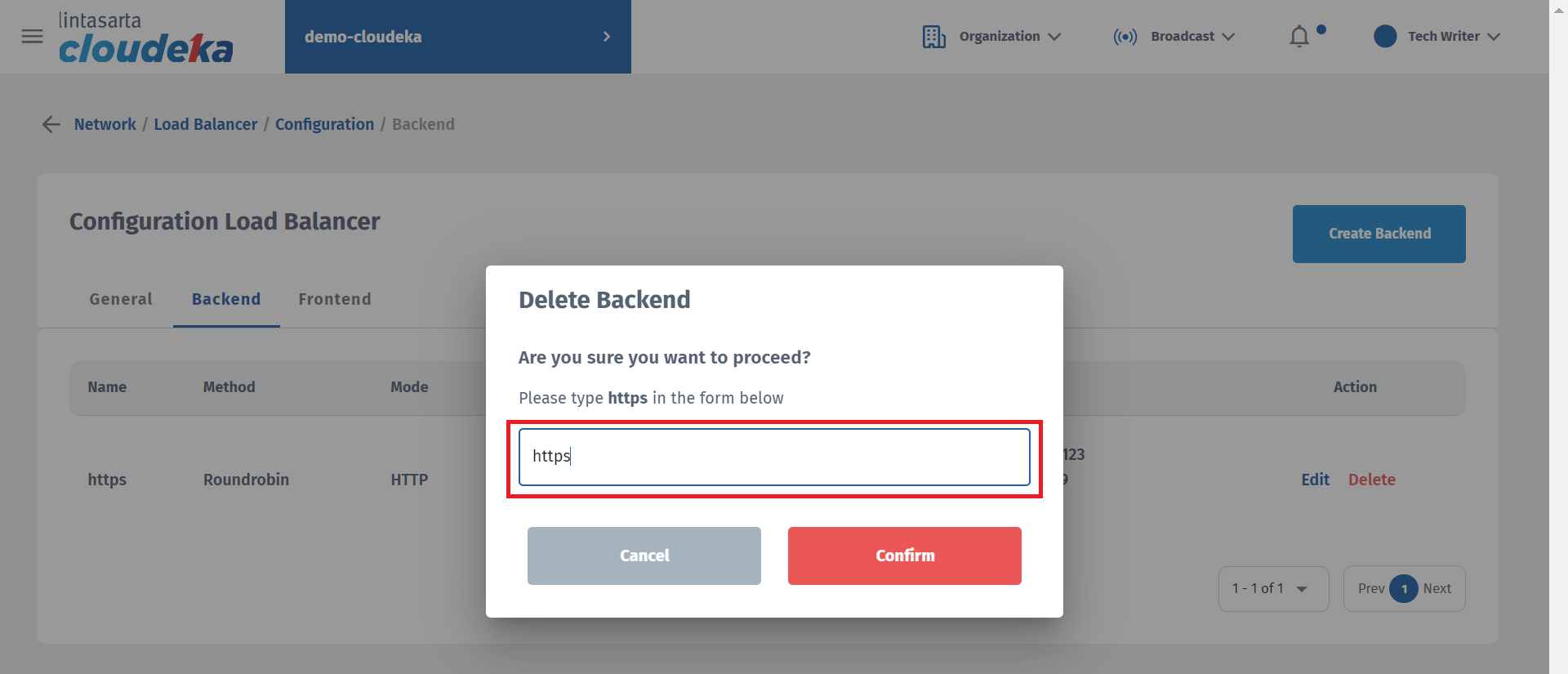 The Delete Backend window appears, enter the frontend configuration name and press the Confirm button to continue the configuration deletion process.